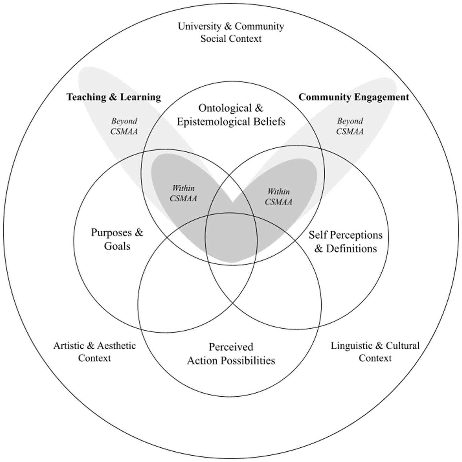 Building on this study’s conceptual framework, findings are presented at two levels: (a) within the CSMAA program and (b) beyond the CSMAA program, with the former nested within the latter. In these contexts, findings highlight the interplay between teaching artists’ onto-epistemic beliefs and other components of the DSMRI: purposes and goals, self-perceptions and self-definitions, and perceived action possibilities (Kaplan & Garner, 2017).