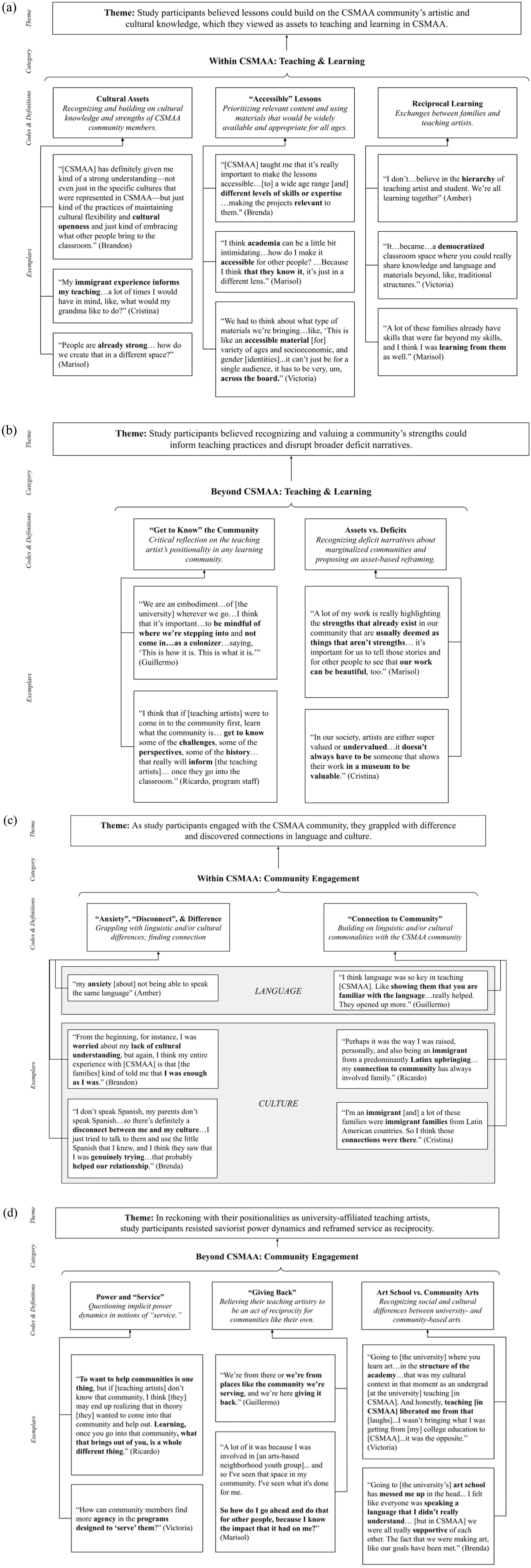 We also used inductive techniques to identify codes, categories, and themes around the two foci of this study: (a) teaching and learning and (b) community engagement. We began our inductive analytic process by identifying in vivo keywords and phrases from the data, grouping together similar excerpts under inductive codes, forming categories of codes, and ultimately constructing themes to summarize those categories (Naeem et al., 2023). For this study’s onto-epistemic purposes, we used a modified values coding scheme (Saldaña, 2016) to represent participants’ values (i.e., enduring onto-epistemic convictions about the nature and importance of various forms of knowledge, creative practices, or cultural systems), attitudes (i.e., orientations toward various ways of being, knowing, or creating), and beliefs (i.e., sentiments about ways of being, knowing, or creating that integrate participants’ personal morals, situated observations, or lived experiences; Saldaña, 2016). We then grouped codes into categories by domain (i.e., either teaching and learning or community engagement) and setting (i.e., either within or beyond the CSMAA program). Finally, we constructed themes to summarize the collective meanings derived from the data, keywords, codes, and categories. These themes constituted the central claims made in our findings. Our analytic process is shown in the selected exemplar data, codes, categories, and themes shown in Figure 2a–d. Throughout this process, we engaged in ongoing dialogue to iteratively interpret the data and develop our codes, categories, and themes, documenting our process in analytic memos.