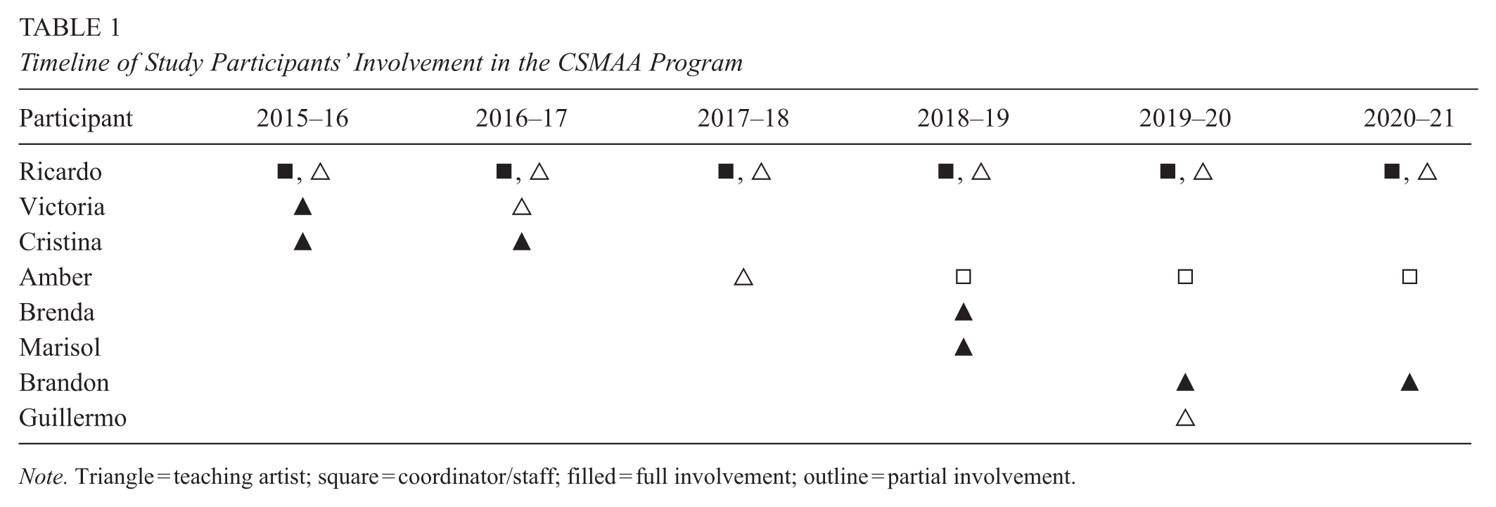 This study foregrounds the experiences of CSMAA program teaching artists. All teaching artists who participated in this study (n = 8) taught in the CSMAA program either as undergraduate students or as recent alumni/ae of the undergraduate arts education program that cofounded the CSMAA program in partnership with the community school.