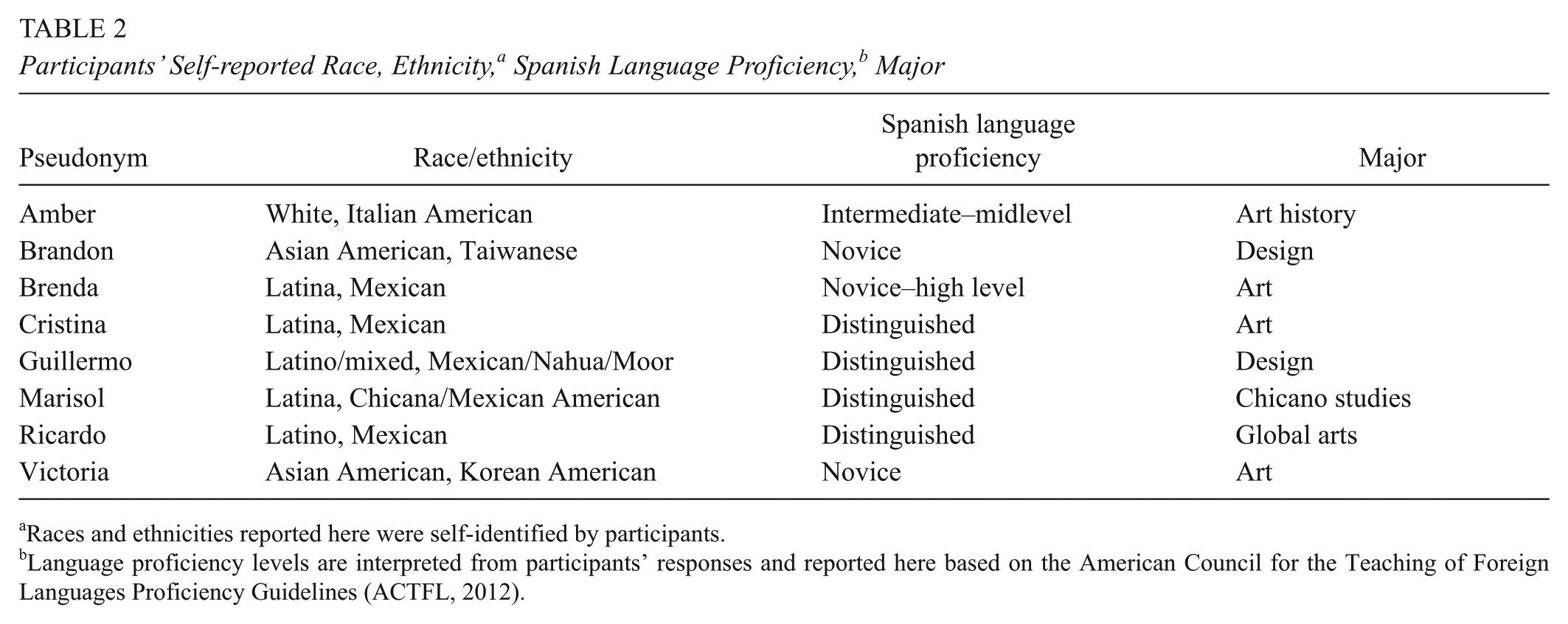 Language proficiency levels are interpreted from participants’ responses and reported here based on the American Council for the Teaching of Foreign Languages Proficiency Guidelines (ACTFL, 2012).