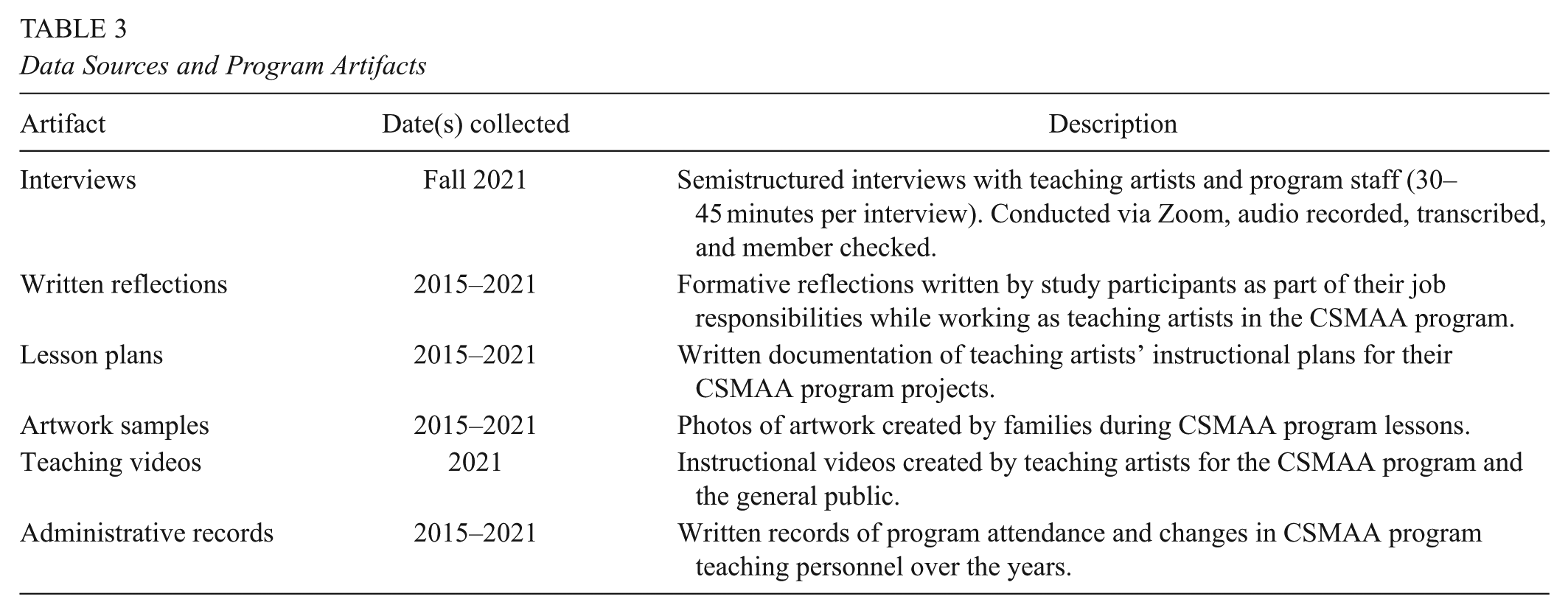 This study triangulated data collected in interviews with early-career teaching artists and program staff, along with other program artifacts collected between 2015 and 2021. Semistructured interviews (30–45 minutes each) were conducted in the fall of 2021 via Zoom with teaching artists and staff who taught and/or worked in the program between 2015 and 2021. During the interviews, study participants were asked to reflect on their time as teaching artists in the CSMAA program and/or coordinating the program. The semistructured interviews focused on their experiences working with CSMAA families and other teaching artists, exploring complex identities in the CSMAA program (including their own) and intersections with other beliefs about teaching, learning, artmaking, or community engagement in the CSMAA program (see Appendix A for the semistructured interview protocol). These interviews were transcribed and member checked. Additional program artifacts included artwork created during lessons led by CSMAA program teaching artists, written reflections authored by CSMAA program teaching artists while teaching in the CSMAA program, video recordings of teaching artists while they were teaching, and administrative records documenting program attendance and personnel changes over the years. For additional details about these artifacts, see Table 3. Artifacts were purposively selected for analysis based on exemplifying teaching artists’ involvement and role identities around teaching, learning, and community engagement.