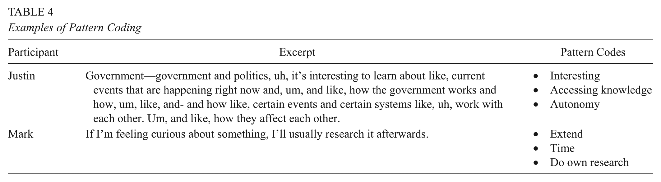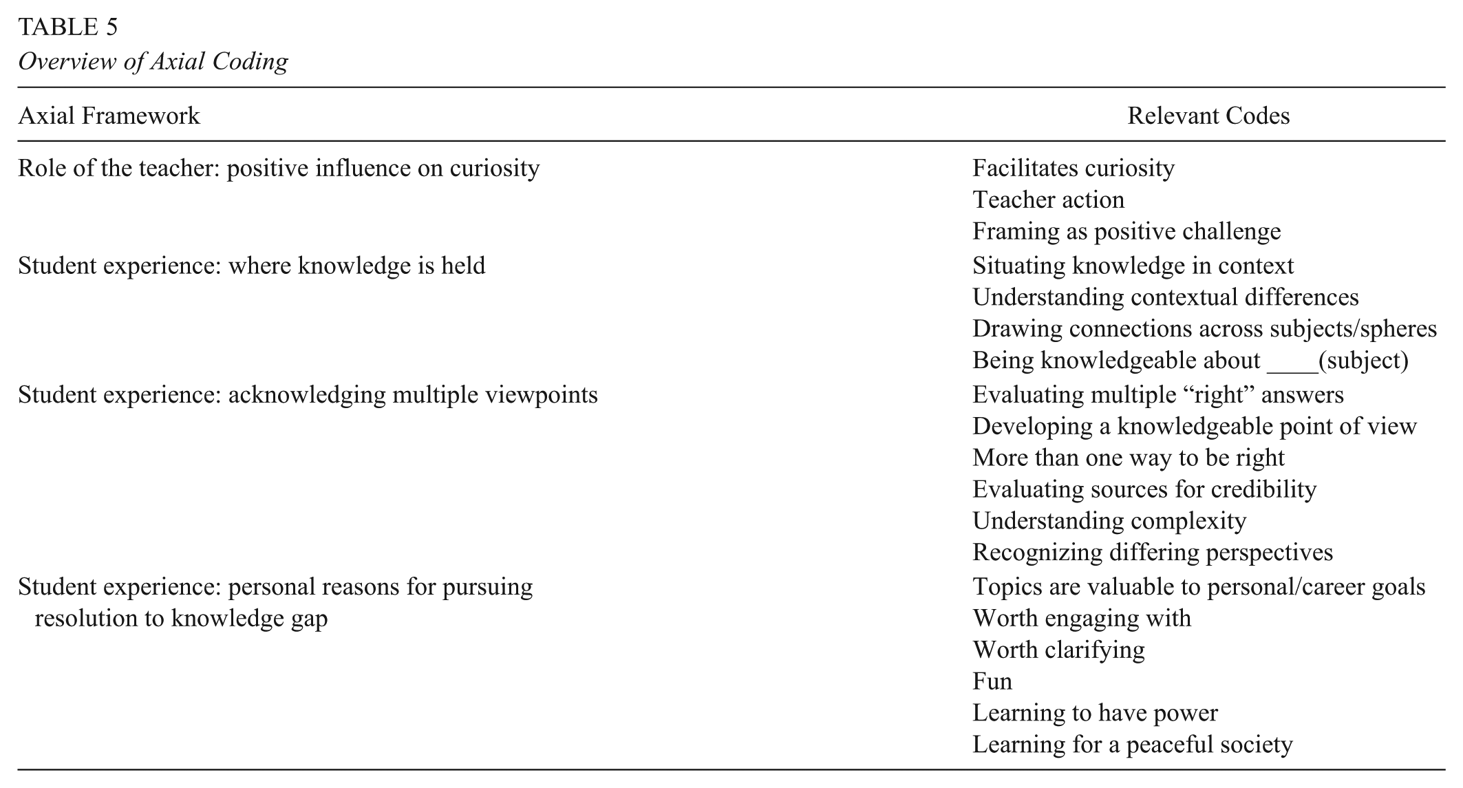 Although most typically associated with grounded theory, we chose to employ axial coding (Charmaz, 2006) to organize and draw connections between the process and pattern codes that we developed in the previous round of coding. This resulted in five categories. The first included codes related to the role of the teacher in students’ descriptions of feeling curious. The remaining categories were each related to the student experience of feeling curious, and included students describing where knowledge is held, the importance of multiple sources or viewpoints, personal reasons for pursuing resolution to a knowledge gap, and actions taken to pursue deeper or additional knowledge. An exemplar is presented in Table 5.