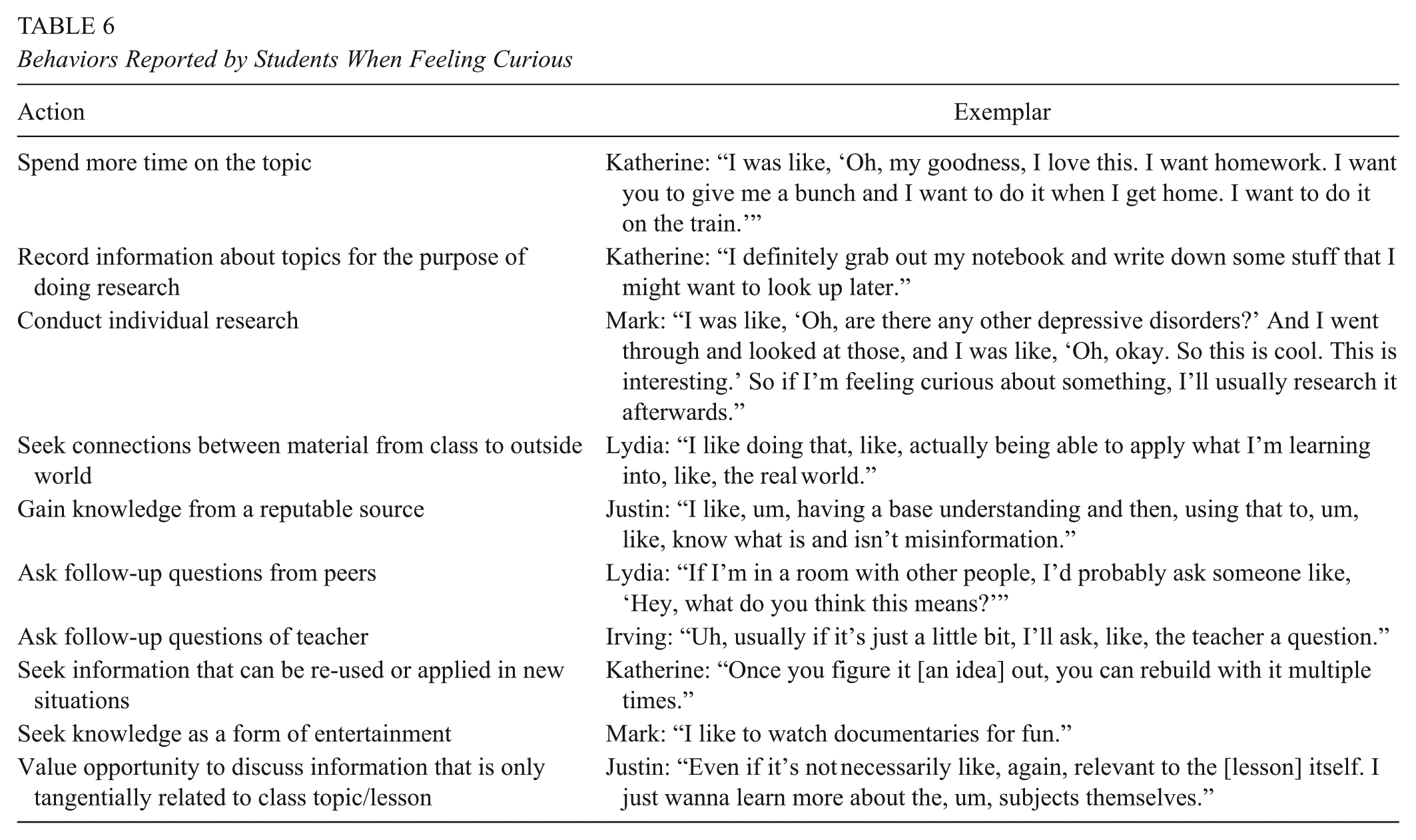 Similarly, Irving described doing independent research on topics he became curious about, framed as spending more time on the content (e.g., self-directed, self-initiated independent inquiry). For Irving, the exchange of time was worth the benefit of the knowledge he attained through his independent research. Justin reported that he would “actually do the work” for topics he felt curious about; that is, rather than engage in additional research or spend more time on the subject outside of class, he indicated that he would participate more fully in work already assigned within the context of the classroom. Within the classroom context, Justin also indicated he would ask questions of the teacher in an effort to extend the content beyond the lesson. Stated differently, he asked questions about content about which he felt curious so that the teacher would make connections between the assigned material or planned lesson and the real world. Whereas other students reported following up on topics they felt curious about at home in self-directed ways, Justin did not report engaging in this same self-initiated inquiry; he just asked extending or connecting questions of the teacher in class. Like Mark, Irving, and Justin, Katherine similarly indicated that she would ask questions in class if she felt curious about a topic, extend the content beyond the context of the lesson, and do independent research. All students were able to describe specific examples of taking these actions in the past.