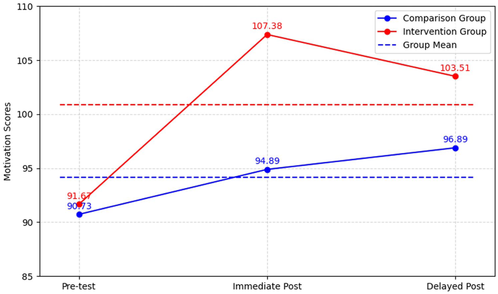 At the delayed post-test, the intervention group sustained relatively high motivation (M = 103.51, SD = 14.08), despite a slight decline from the immediate post-test. This pattern suggests that the motivational benefits of ChatGPT-4o were not limited to the short term but persisted for at least one month. By comparison, the control group continued on a gradual upward trend, reaching 96.89 (SD = 18.32) at the delayed post-test, but their improvement remained modest in magnitude.