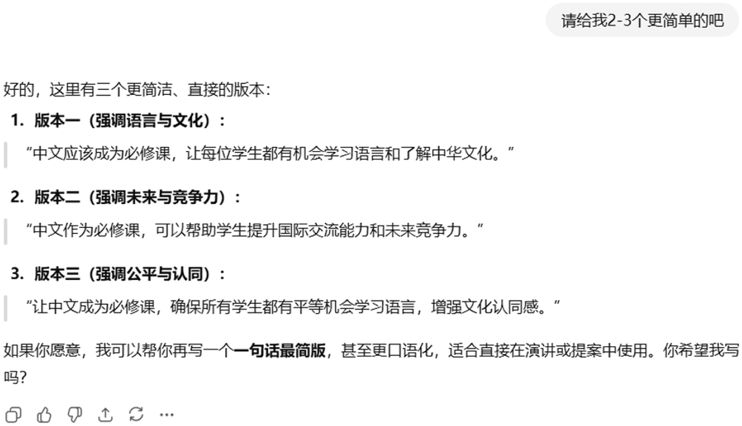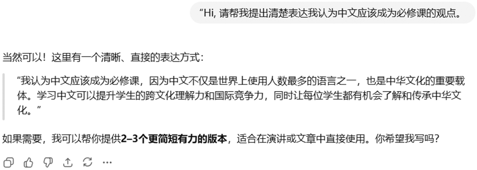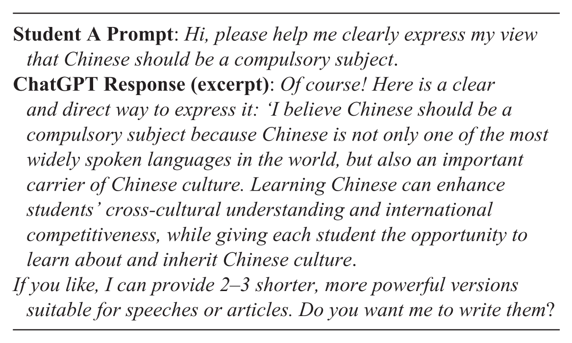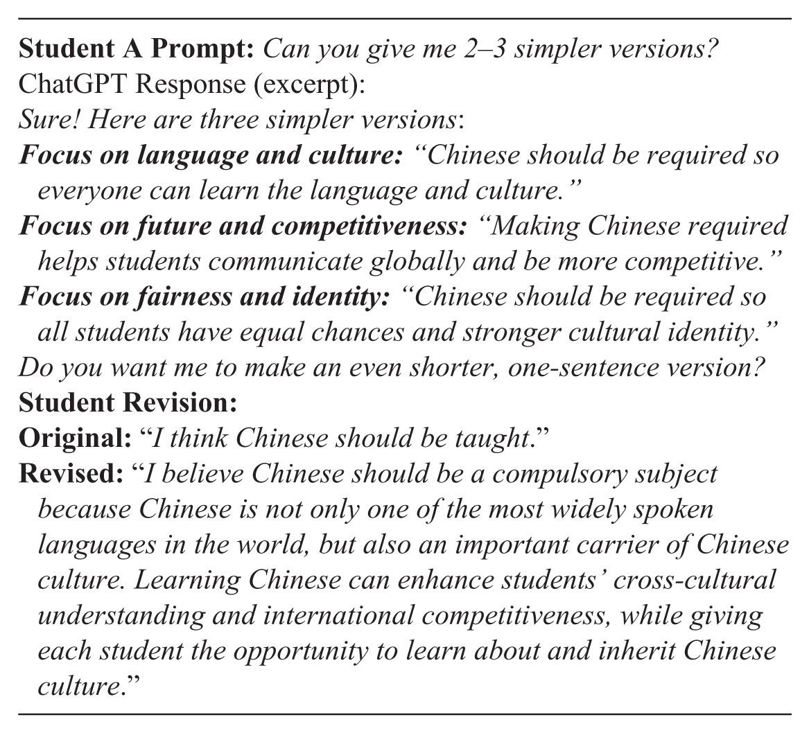 This example shows a student, here given the pseudonym “Student A,” prompting ChatGPT to articulate their stance that Chinese should be a compulsory subject in Malaysian universities. ChatGPT suggested multiple ways to structure the argument, and the student revised their thesis accordingly.