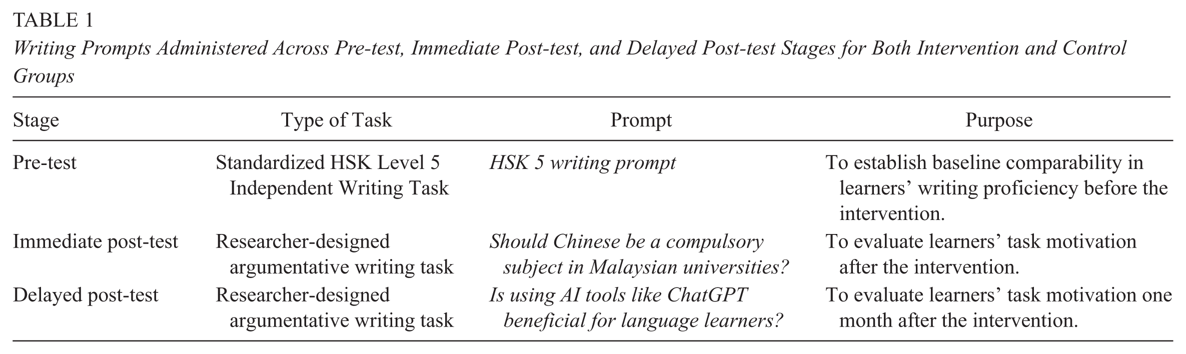 All participants in both the intervention and control groups responded to the same prompts at each stage, ensuring methodological comparability. The inclusion of the ChatGPT-related prompt was intentionally pedagogical, as it aligned with the study’s central research aim and encouraged learners to critically reflect on a current and authentic educational issue. We acknowledge that participants in the intervention group may have been influenced by prior engagement with ChatGPT, potentially enhancing initial motivation. To maintain methodological consistency, prompts were fixed across testing stages rather than rotated or counterbalanced. This design choice allowed for a controlled examination of task motivation while highlighting potential novelty effects associated with AI-mediated writing.