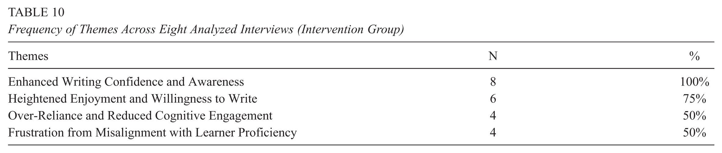 Taken together, these themes extend the quantitative findings by illustrating the lived experiences underlying motivational changes, showing how AI-mediated writing both supports and challenges motivation and self-regulation. Table 10 summarizes the frequency of each theme across the eight interviews.