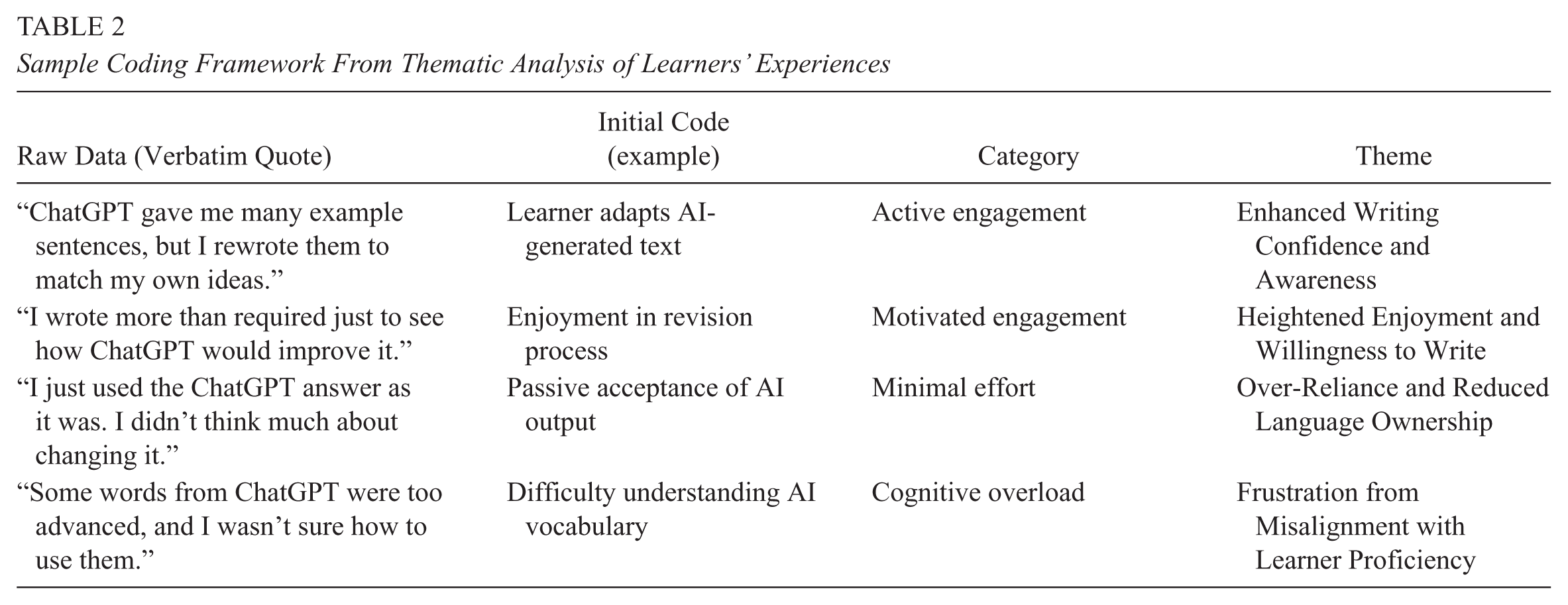 Qualitative analysis of the eight intervention interviews revealed four central themes, which correspond to the coding framework presented in Table 2. These insights help explain the quantitative trends without overclaiming, showing potential benefits alongside observed constraints. Learners reported increased confidence in structuring sentences, applying linking words, and managing tone appropriately; many also experienced greater enjoyment and motivation to engage with writing tasks. Conversely, some learners demonstrated over-reliance on ChatGPT and occasional frustration when AI output exceeded their proficiency. These patterns suggest that AI-mediated support can facilitate engagement while also posing challenges for some learners.