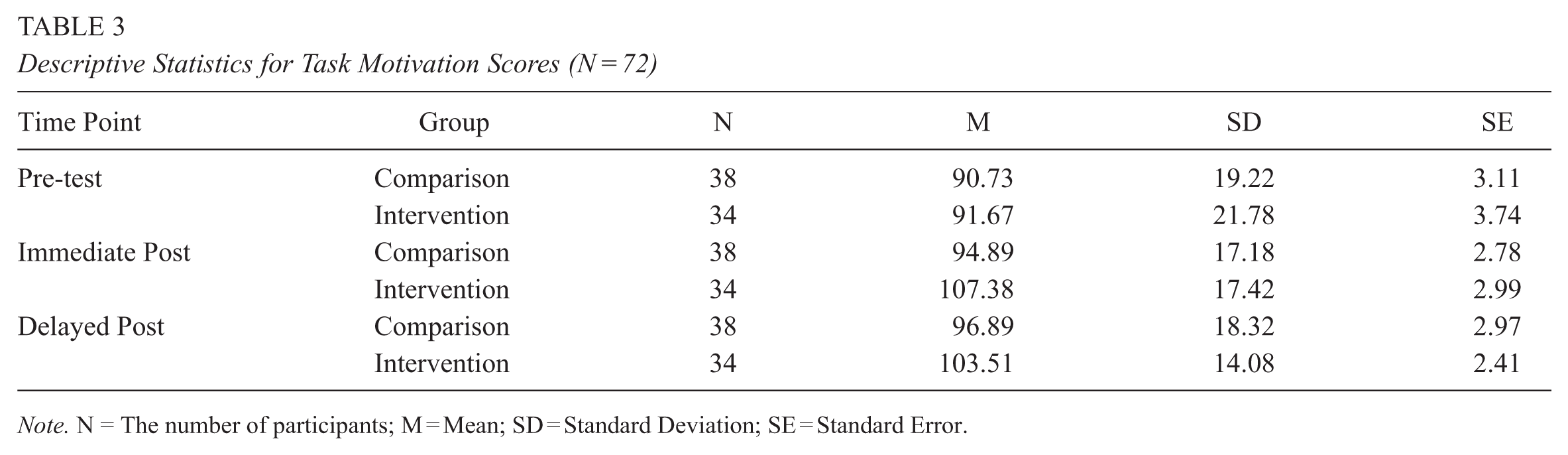 To gain further insight into motivational trajectories within each group, separate repeated measures ANOVAs were conducted. For the comparison group, no significant variation in motivation was observed across the three assessment points—pre-test, immediate post-test, and delayed post-test, F(1.88, 70.56) = 1.18,