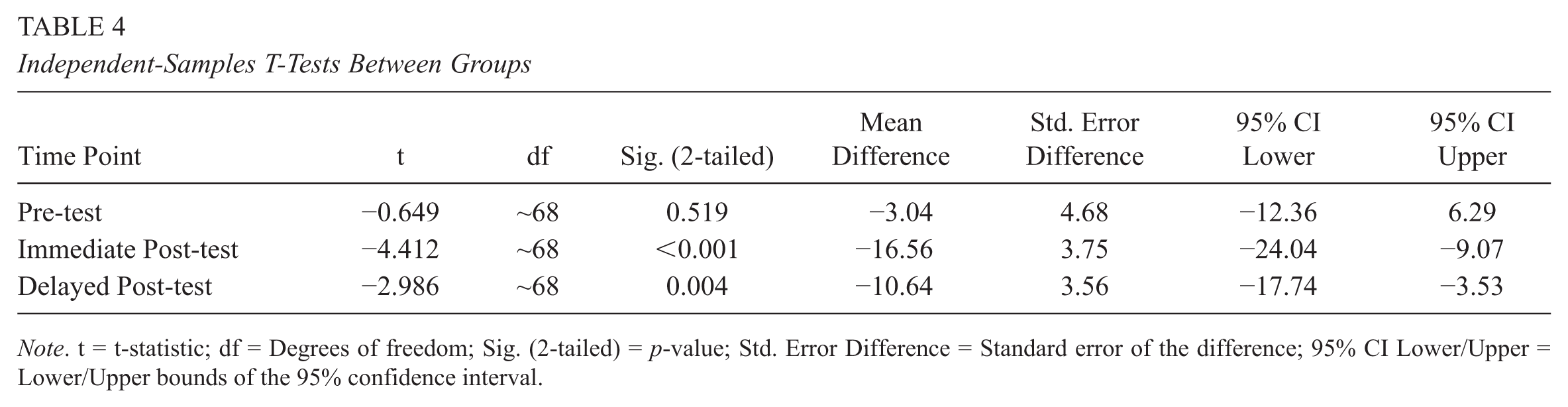 Having established baseline equivalence, the analysis turned to the central RQ1. Descriptive statistics for both groups across the three measurement points (pre-test, immediate post-test, and delayed post-test) are presented in Table 3.