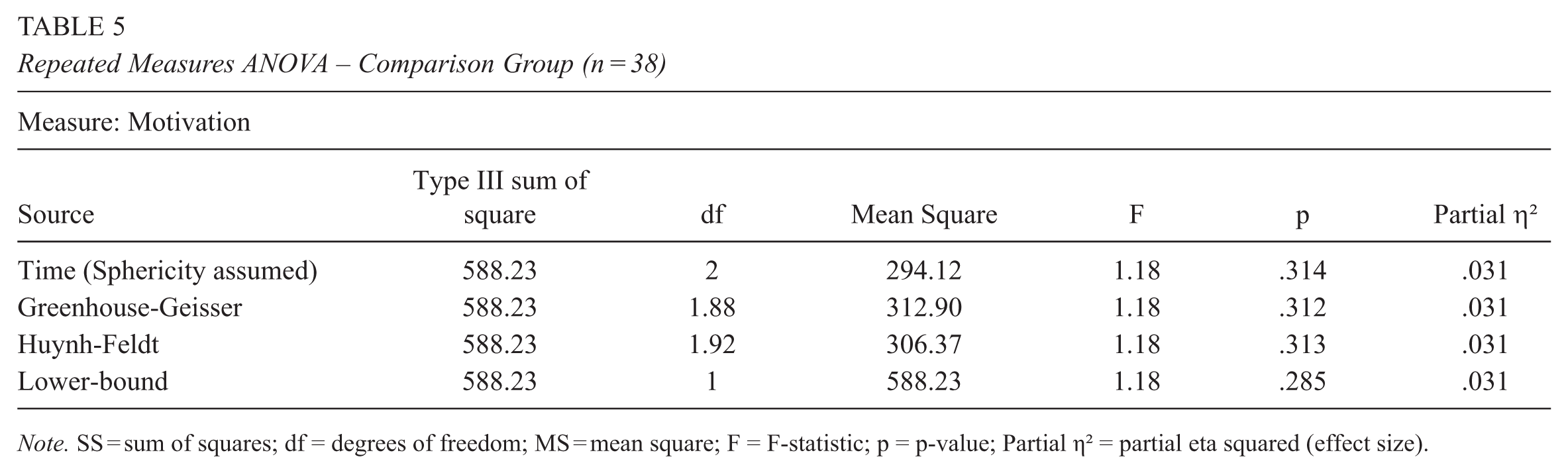 Repeated Measures ANOVA – Comparison Group (n = 38)