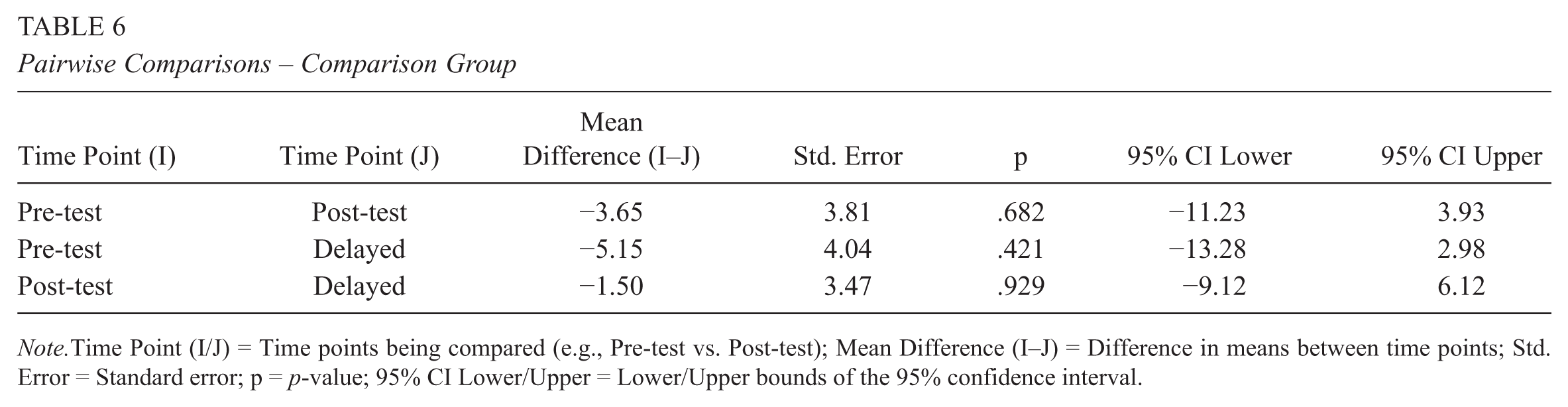Pairwise comparisons (Table 6) confirmed the absence of significant changes between any two time points (all ps > .40), suggesting that learners in the comparison group maintained relatively stable motivation throughout the study period.