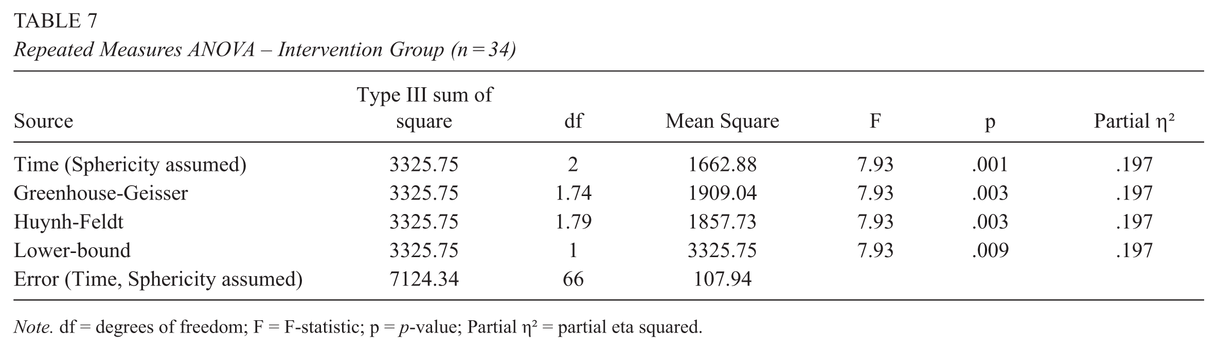 Repeated Measures ANOVA – Intervention Group (n = 34)