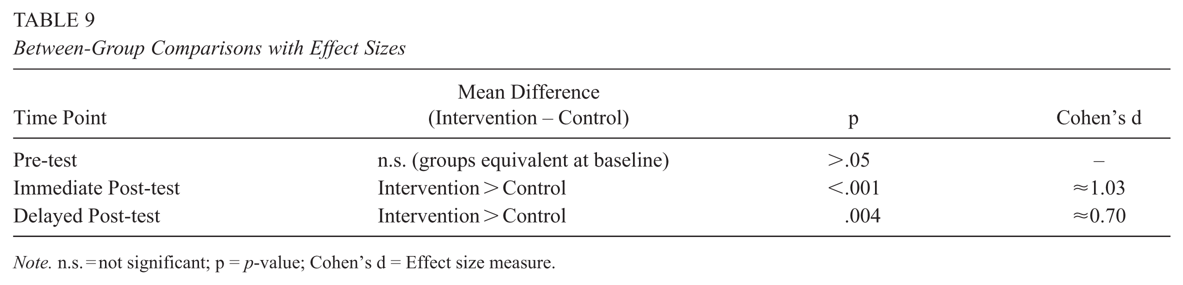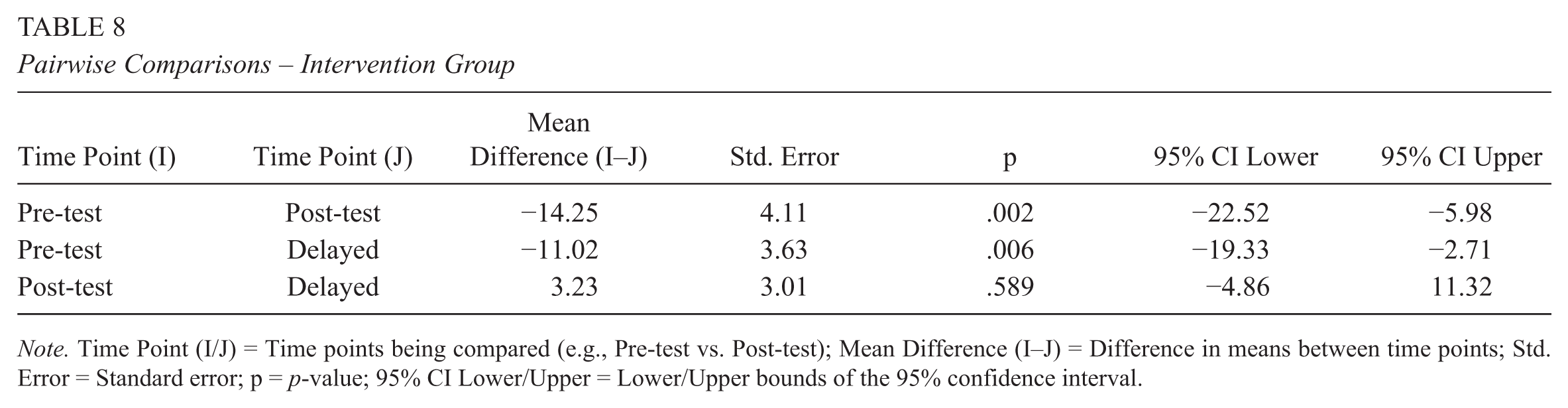 Pairwise comparisons (Table 8) revealed that learners’ motivation in the intervention group increased significantly from pre-test to immediate post-test (