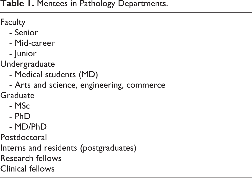 As career development, teaching, research, and clinical care become more complex, there is an urgent need to go beyond serendipitous mentoring and create a sustained culture of effective mentorship in all academic departments of pathology. 7 –9 Formal mentorship should be an important academic activity that supports the members of departments of pathology in their quest to develop and maintain a community of high-quality clinicians and scholars among faculty, students, and trainees. Often we regard new junior faculty to be the most in need of mentorship. This is usually the case however as their career progresses into new areas, mid-career, and senior faculty benefit from mentorship as well. As well, the wide array of trainees including residents and fellows, medical students, graduate students, and undergraduates all benefit from mentorship from pathology faculty (Table 1). Pathology faculty should consider mentoring trainees outside pathology in other disciplines and programs as well. Mentoring of medical students by pathologists is of critical importance in exposing these students to a career in pathology, since unfortunately most medical students are not exposed to the clinical practice of pathology and the academic environment of departments of pathology. 10