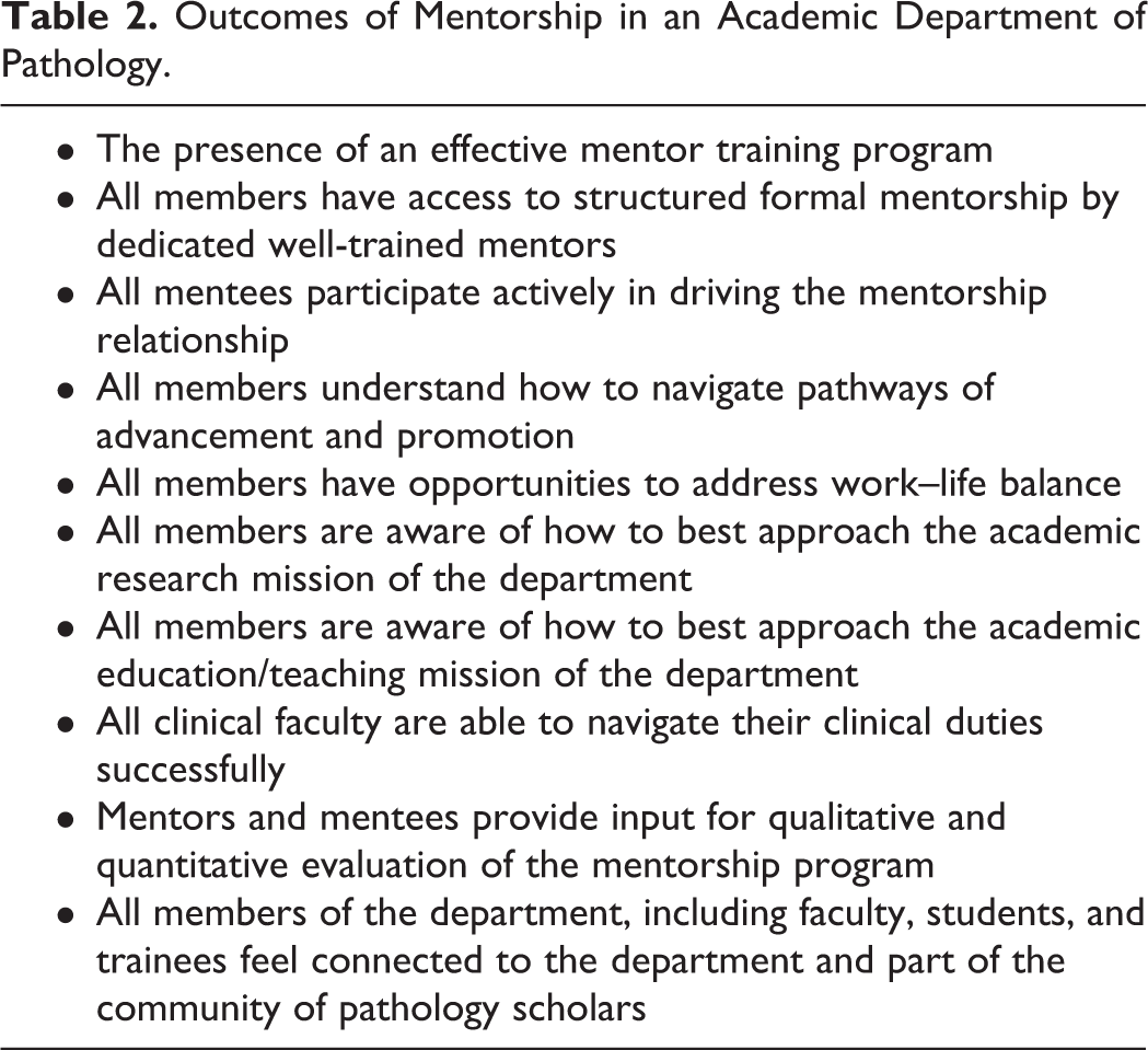 As departments embrace a culture of mentorship, it is important to clearly define departmental performance indicators and expected outcomes of the mentorship process (Table 2). These accountability criteria will likely change over time in the dynamic environment of academic pathology. It is useful to have a mentorship survey periodically, for example, every 2 to 3 years, to collect data on mentorship accessibility, effectiveness, strengths and weaknesses and to solicit suggestions for improvement. The survey should have questions for both mentees and mentors. 7 There is an extensive list of items for mentors and mentees to respond to which cover academic, professional, social, and personal issues. 7 These surveys are useful in determining whether the department is on a positive trajectory in its mentorship mission and in identifying changes that are required to maintain a sustainable community of medical scholars.