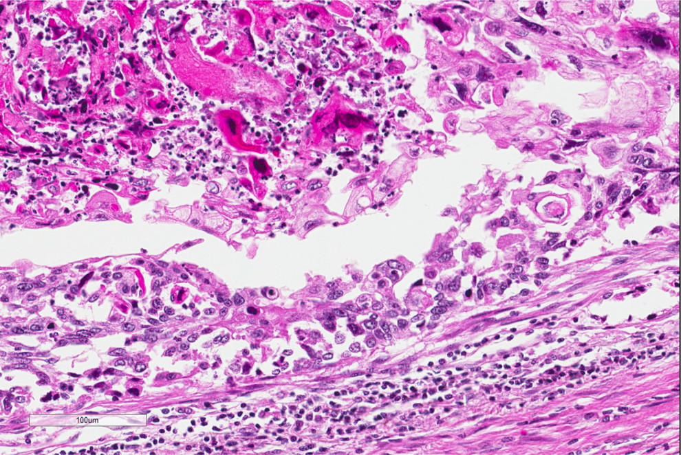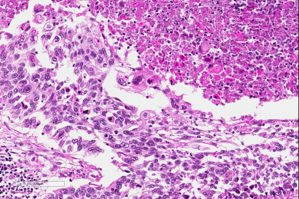 Histopathology of the lung biopsy. A low-power image showing extensive tumor on the right hand side, with nests of tumor cells infiltrating into the pulmonary parenchyma on the left.