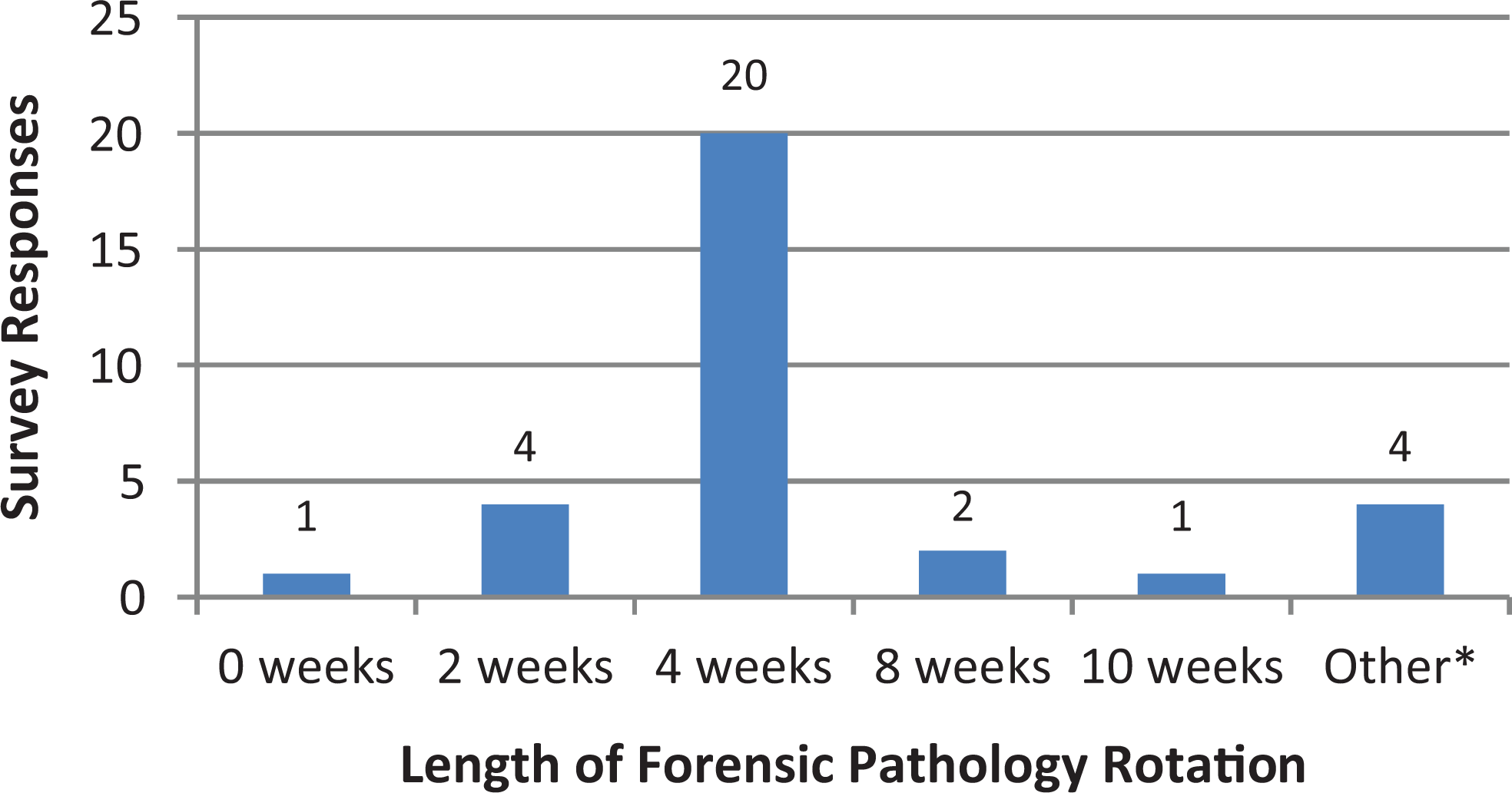 Length of forensic pathology rotation (n = 31). Other*: Programs indicated that forensic pathology is incorporated into autopsy pathology and cannot be delineated.