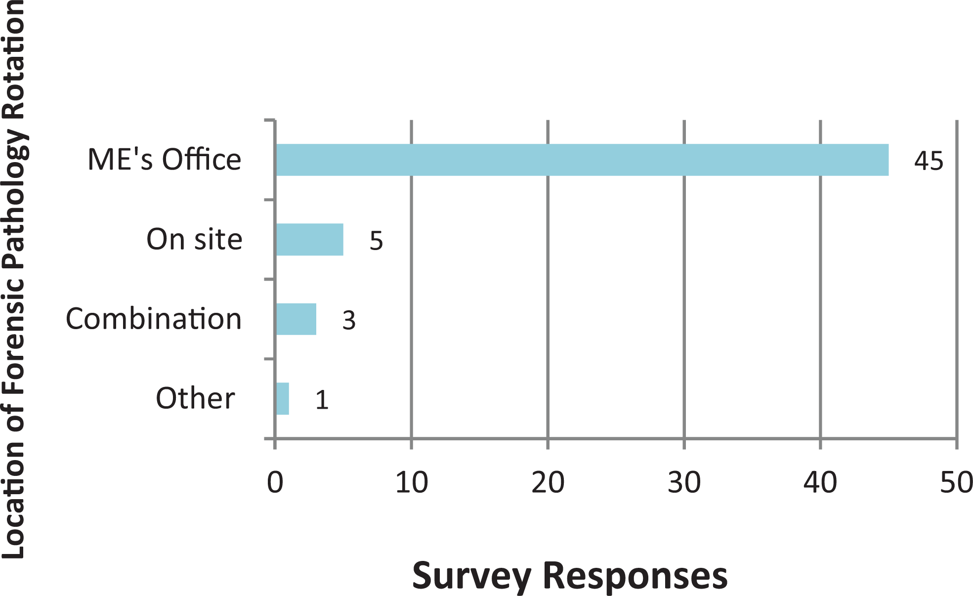 There were 54 responses (38.3% of the 141 programs) to our national survey from a diverse group of pathology residencies across the country, with the program’s size ranging from 4 up to 38 combined anatomic and clinical pathology (AP/CP) or AP only residents. Although our survey showed that most programs do require a forensic pathology rotation (51 [94.4%] of 54 responses), there are still some programs that do not (3 [5.6%] of 54 responses).