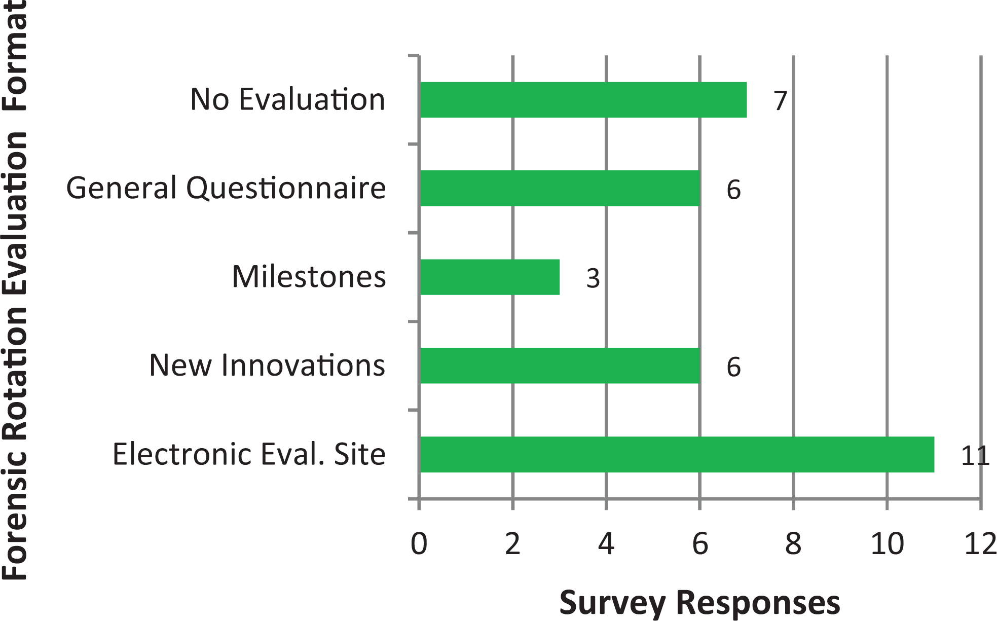 In reviewing the results regarding the logistics of the offered forensic pathology rotations, some promising common themes emerged. Figure 1 shows that most forensic pathology rotations are 4 weeks in length. A small portion of these respondents indicated that the forensic autopsies are conducted within their hospital; thus, forensic pathology is an integral part of their autopsy service and curriculum. However, as expected, the majority of residents have their forensic pathology rotations at a medical examiner’s office (see Figure 2). When asked if their programs have set prerequisites before taking the forensic pathology rotation, 23 (42.6%) of the 54 participants indicated that they did not. Of those that do, the prerequisites consist mostly of a certain amount of autopsy rotations, are delineated by the level of postgraduate training year (PGY), or some combination of both, as shown in Figure 3. The required autopsy exposure was found to be highly variable, ranging from undefined general autopsy experience to expecting completion of 4 months’ worth of autopsy rotations (see Figure 4). Figure 5 illustrates that most residents have their forensic pathology rotation during the second or third postgraduate training year. A substantial number of residents, in at least 14% (2 of 14 respondents) of the programs, have their rotations during the fourth postgraduate training year. While on rotation, it was found that the residents are exclusively being evaluated by the forensic pathology faculty. As Figure 6 demonstrates, while most use an electronic evaluation form (MedHub, E*Value, or New Innovations), a considerable portion (7 [21.1%] of 33 responses) of these programs’ residents are not receiving documented evaluations for this rotation.