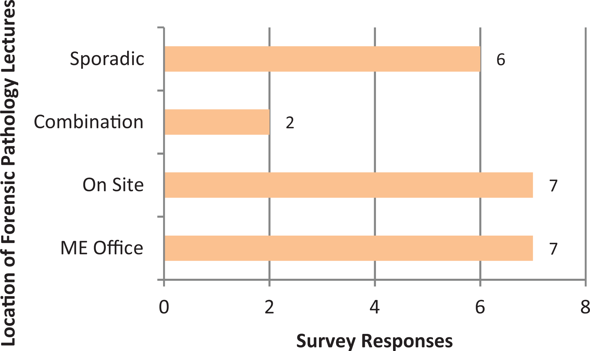 Only 21 (39.6%) of the 53 respondents indicated that they have a defined forensic pathology curriculum. For those programs that have an established forensic pathology curriculum, 61% (11 of 18 respondents) stated that this curriculum was left up to the supervising forensic pathologist. Six participants commented that their curriculum is “very generic” or “needs work.” The curriculum includes defined forensic pathology lectures for 37 (69.8%) of the 53 respondents, and for 32 (91.4%) of 35 programs, these lectures are given by a forensic pathologist. Interestingly, Figure 7 shows that the location of the lecture is variable, with some 27.3% (6 of 22 respondents) being given sporadically or on an “as-needed” basis. Furthermore, only 1 respondent indicated that the forensic lectures were part of their residency’s core curriculum.