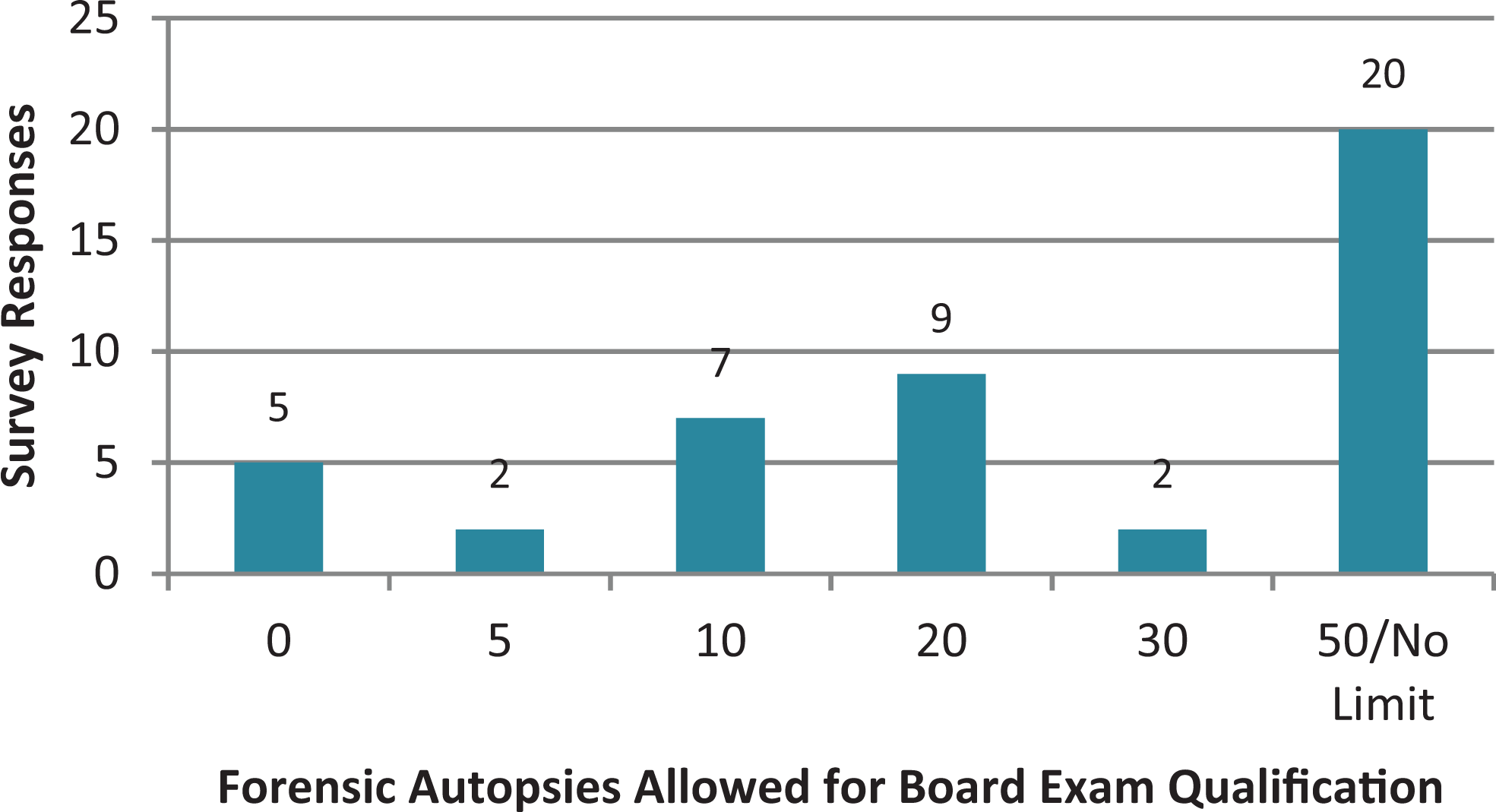 This variability in forensic autopsy experience, taken with the general laxity in reporting guidelines for board examinations, illustrates the fact that programs should adopt a policy for limiting the number of forensic autopsies allowed for board examination qualification. Unfortunately, more data are necessary before such a determination can be made. Until this complex issue can be further investigated, each residency program would benefit from implementing their own protocols based on their specific autopsy and forensic service opportunities, as well as good communication with the forensic pathologist in charge of the forensic pathology rotation.