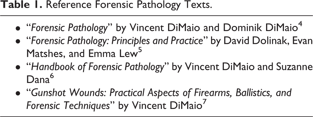 Aside from the curriculum for residents while on their forensic pathology rotation, forensic pathology lectures should be incorporated into a program’s routine core curriculum series. Our survey identified one program with such lectures as part of their core curriculum. Ideally, these lectures would also be given by a board-certified forensic pathologist; however, additional lectures by a forensic pathology fellow, an interested resident, pathologist, or even decedent care staff could also be beneficial. These lectures should be aimed at introducing residents to general high-yield topics in forensic pathology to ensure an appropriate level of knowledge in the field. These topics may include an introductory lecture, common injury or wound patterns (such as sharp force injuries, gunshot wounds, and blunt force trauma), asphyxia, time of death, postmortem changes, introduction to ballistics, introduction to toxicology, pediatric forensic pathology, and so on. These fundamental topics are typically highlighted in the standard forensic pathology texts, as demonstrated in Tables 1 and 2.
