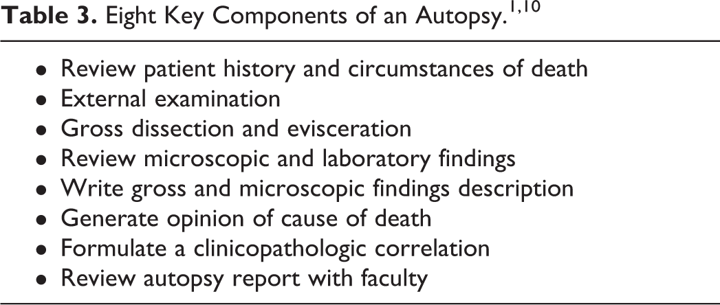 In response to some of these issues, an Autopsy Working Group (AWG) of the APC was formed in 2014. This group has recently released its final recommendations to assist programs in maintaining the academic and technical standards necessary for adequate resident training in autopsy pathology. These recommendations stress the importance of communication between the program director and the autopsy director and introduces the idea of “entrustable professional activities” that will help to ensure standardization in both teaching and performing autopsies by employing autopsy-specific competencies defined in the ACGME milestones. Furthermore, the AWG suggested methods of documentation to ensure a complete record of resident participation in all aspects of the autopsy and only upon completion can the case be used for the 50 autopsies needed for the board examinations. 22 These concepts easily lend themselves for use in forensic pathology training. Standardization of resident expectations, skill sets, and knowledge base with thorough documentation would confirm universal resident competency and qualification.