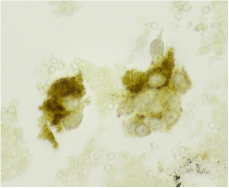 Immunohistochemical stain, performed on the cellblock, shows that the neoplastic cells are positive for calcitonin (cytoplasmic and granular staining; high power ×60 magnification).