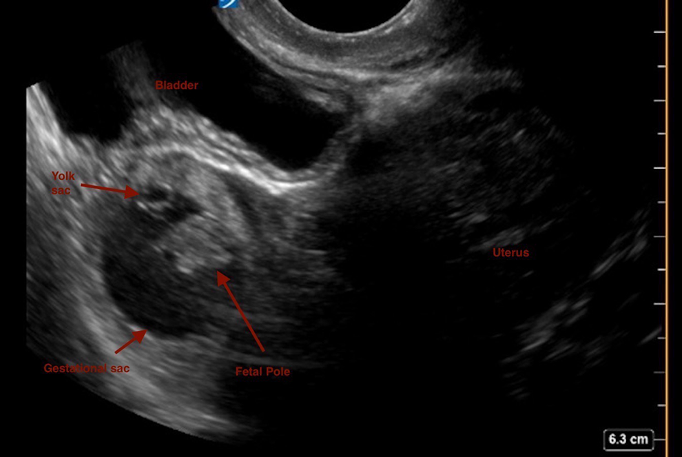 The patient had a positive urine pregnancy test and a serum βhCG resulted at 4979 mIU/mL (negative is <5 mIU/mL). The patient’s transvaginal ultrasound (TVUS) is shown in Figure 1.