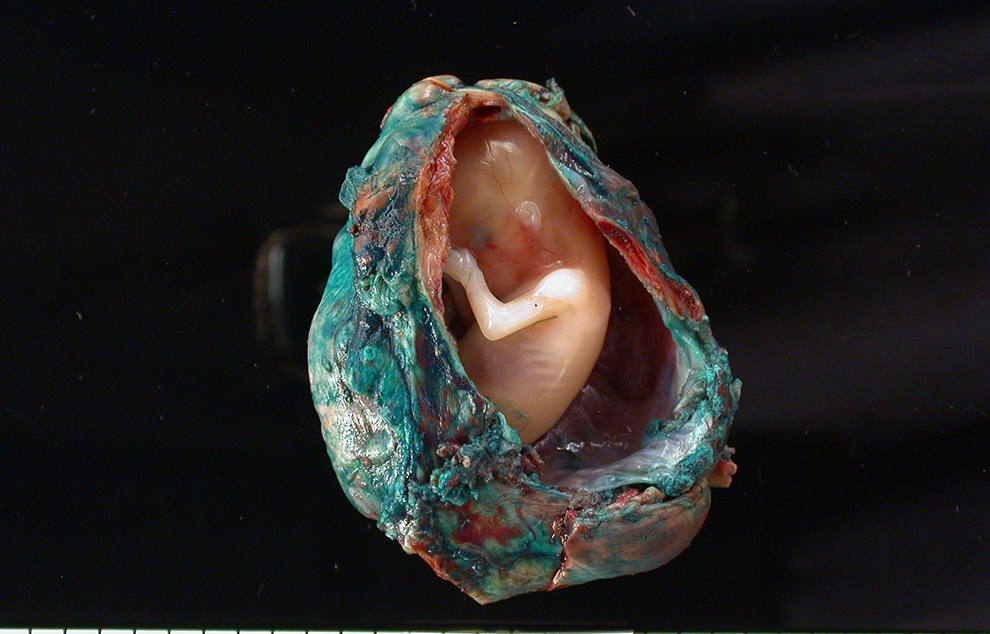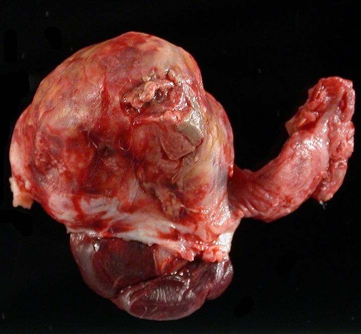 Gross tubal ectopic pregnancy. The dilated portion of the tube contains an intact fetus.