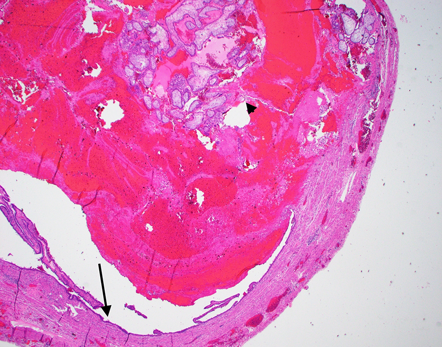 Cross section of fallopian tube diagnostic of an ectopic/tubal pregnancy. H&E-stained section at ×20. Note the fallopian tube epithelium (arrow) and luminal hemorrhage with chorionic villi (arrowhead).