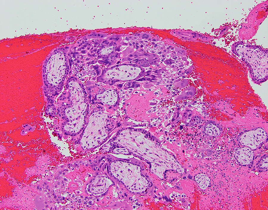 A tubal ectopic pregnancy can be grossly described as a distended fallopian tube with a thin wall, which may be ruptured, with dusky and dark serosa (Figure 3). Sectioning usually reveals hemorrhage with villous-appearing tissue. Fetal parts may be seen occasionally (Figure 4). On histology, chorionic villi associated with the fallopian tube is diagnostic of an ectopic pregnancy (Figures 5 and 6). Hemorrhage within the tubal lumen is often present.