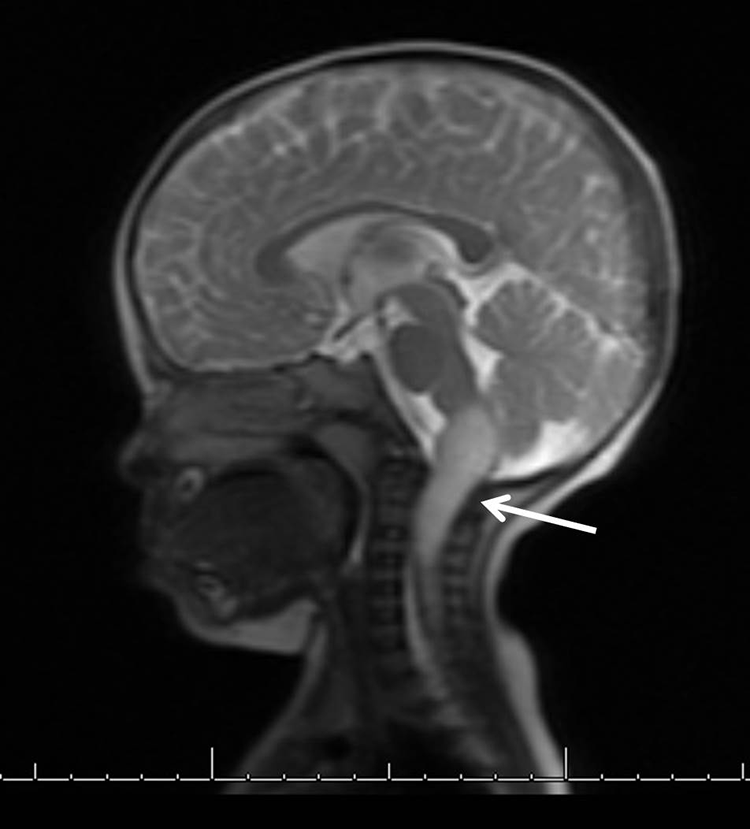 Chest X-ray, left lower extremity X-ray, and hip ultrasound are normal. A BMP, CBC, CRP, and ESR are normal. Computed tomography imaging of the head demonstrates an incompletely imaged expansile lesion involving the medulla/upper cervical spinal cord. Follow-up MRI of the brain confirms an intraparenchymal expansile mass (4.6 × 1.9 × 1.9 cm) with T2 hyperintensity and heterogeneous enhancement in the medulla extending inferiorly into the cervical cord to the upper C4 level (Figure 1). The imaging studies are negative for other lesions.