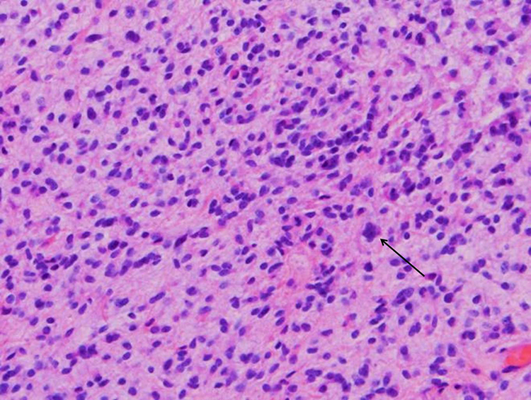 Areas of moderate to high cellularity with occasional mitotic figures (black arrow). Magnification = ×40.