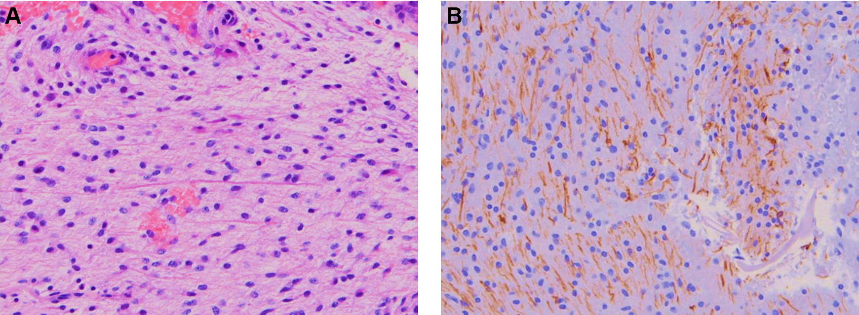 (A) Areas where the lesional cells were growing around and entrapping neuronal process, which are (B) highlighted by the neurofilament stain. Magnification = ×40.