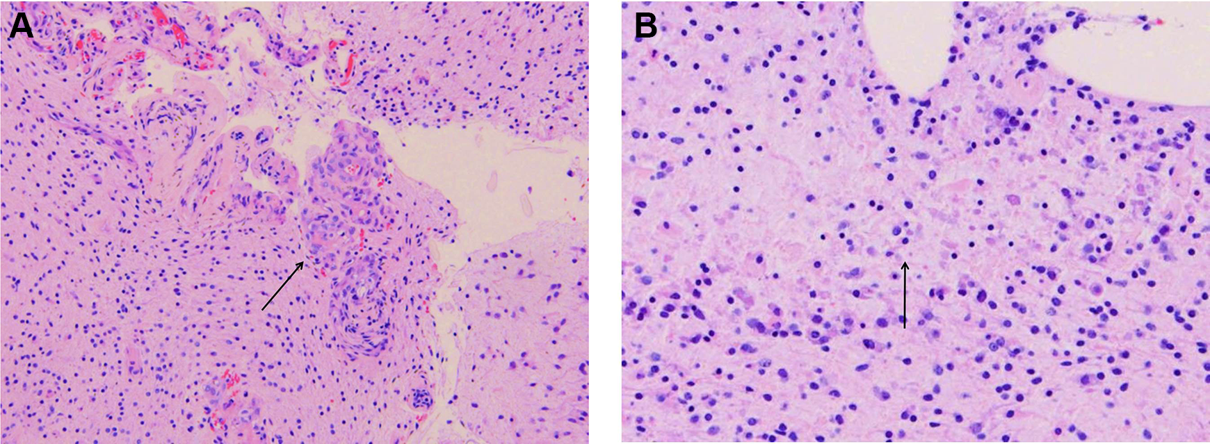 (A) Focal areas of vascular proliferation (black arrow) and (B) necrosis (black arrow). Magnification = ×40.