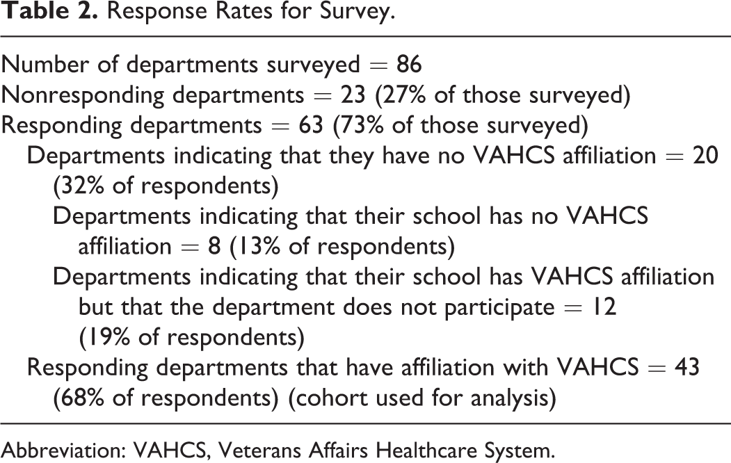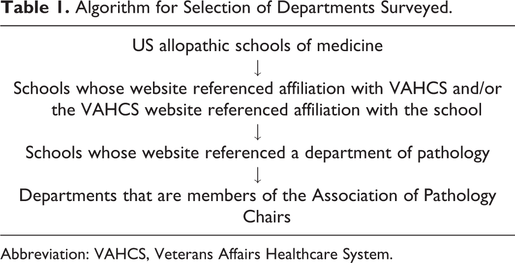 The current allopathic schools of medicine in the United States were identified from the most recent listing in Wikipedia. 11 The website of each US allopathic school of medicine was then queried for reference to an affiliated VAHCS and/or the website of that affiliated VAHCS was reviewed for reference to its affiliated school of medicine. Nondegree granting academic medical centers were not included because the 1946 policy memorandum 1 established that affiliations would be with schools of medicine. In addition, osteopathic schools of medicine were not included in this study due to their smaller number, the fact that many of them lack departments of pathology that offer graduate medical education, and the fact that affiliations were historically launched with allopathic schools of medicine. The website of each identified school was then examined to verify that it had a department of pathology. In order to facilitate contact with those departments, only departments of pathology that are members of the Association of Pathology Chairs (APC) were selected. Eight departments in schools with affiliated VAHCS were not members of APC and were not surveyed. This selection algorithm (Table 1) yielded 86 departments to be surveyed.