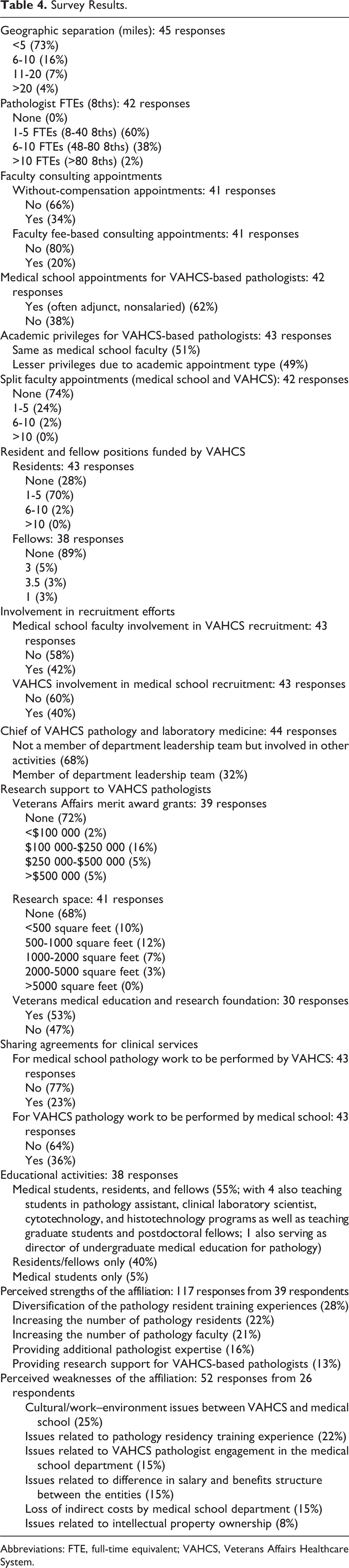 Narrative comments provided by some respondents indicated considerable variability among the respective affiliations, ranging from full integration of anatomic pathology cases into the medical school department workflow to no integration at all. The immense value of the educational experience for trainees was recognized by all. In a few instances, respondents expressed frustration with perceived rigidity of the VAHCS contracting and human resources processes.