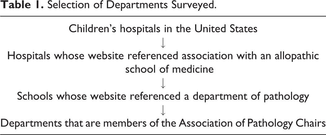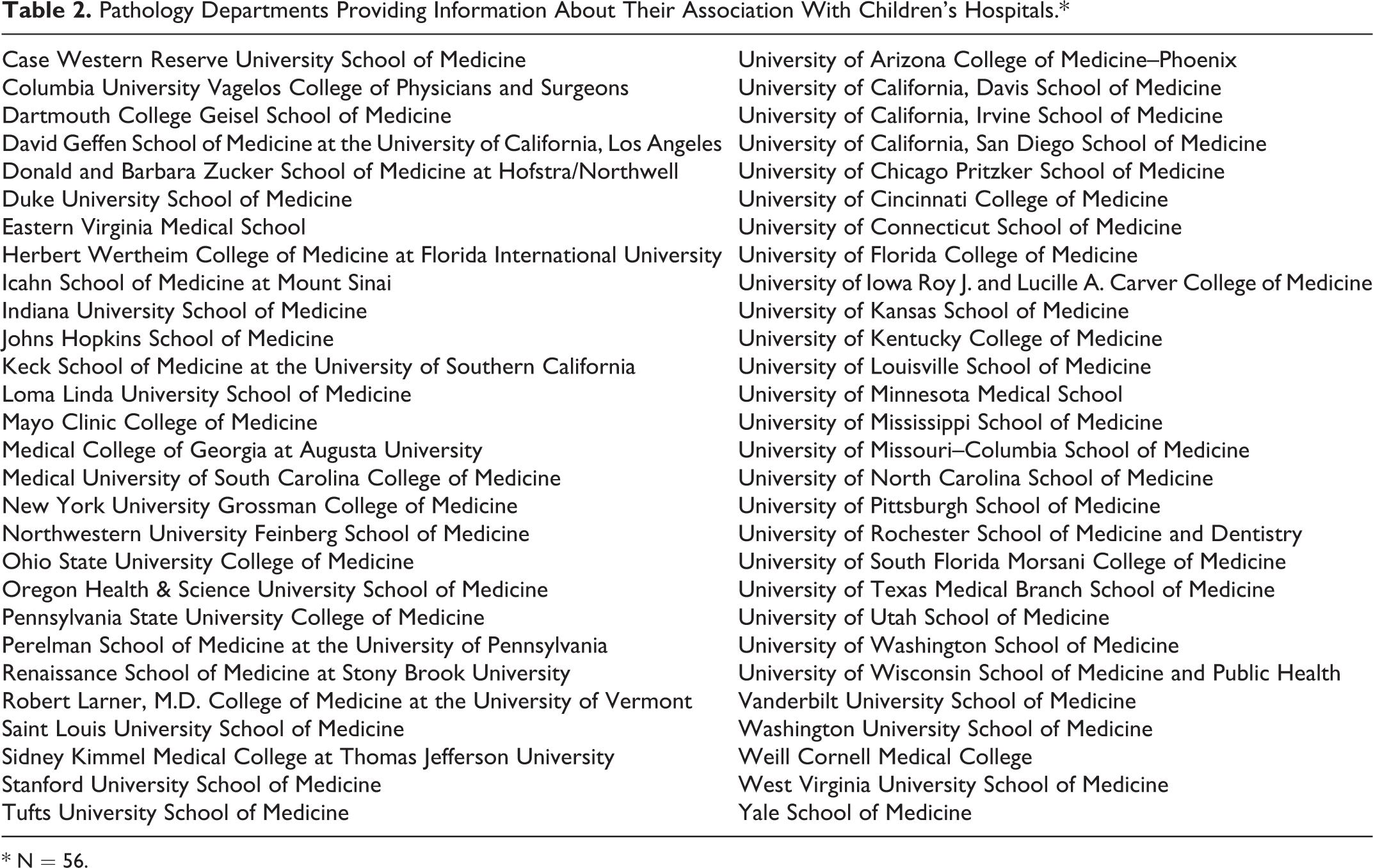 Children’s hospitals in the United States were identified from Wikipedia. 9 The website of each hospital was then queried for reference to an association with an allopathic school of medicine. Nondegree granting medical centers that could be affiliated with children’s hospitals were not included because part of the assessment was to be medical school student and postgraduate training in the children’s hospital. Similarly, osteopathic schools were not included because they typically do not have postgraduate pathology training programs. The existence of a department of pathology in those allopathic medical schools that were associated with a children’s hospital was verified by examining the website of the school. In order to facilitate contact with the department, only those departments of pathology that were members of the APC were included in the study. Harvard Medical School and Boston Children’s Hospital were not included in this study because the Harvard Department of Pathology has its postgraduate pathology training programs based in its affiliated hospitals (Massachusetts General Hospital, Brigham & Women’s Hospital, and Beth Israel Deaconess), and thus, the medical school department of pathology’s association with the children’s hospital differs from that of other academic departments of pathology.