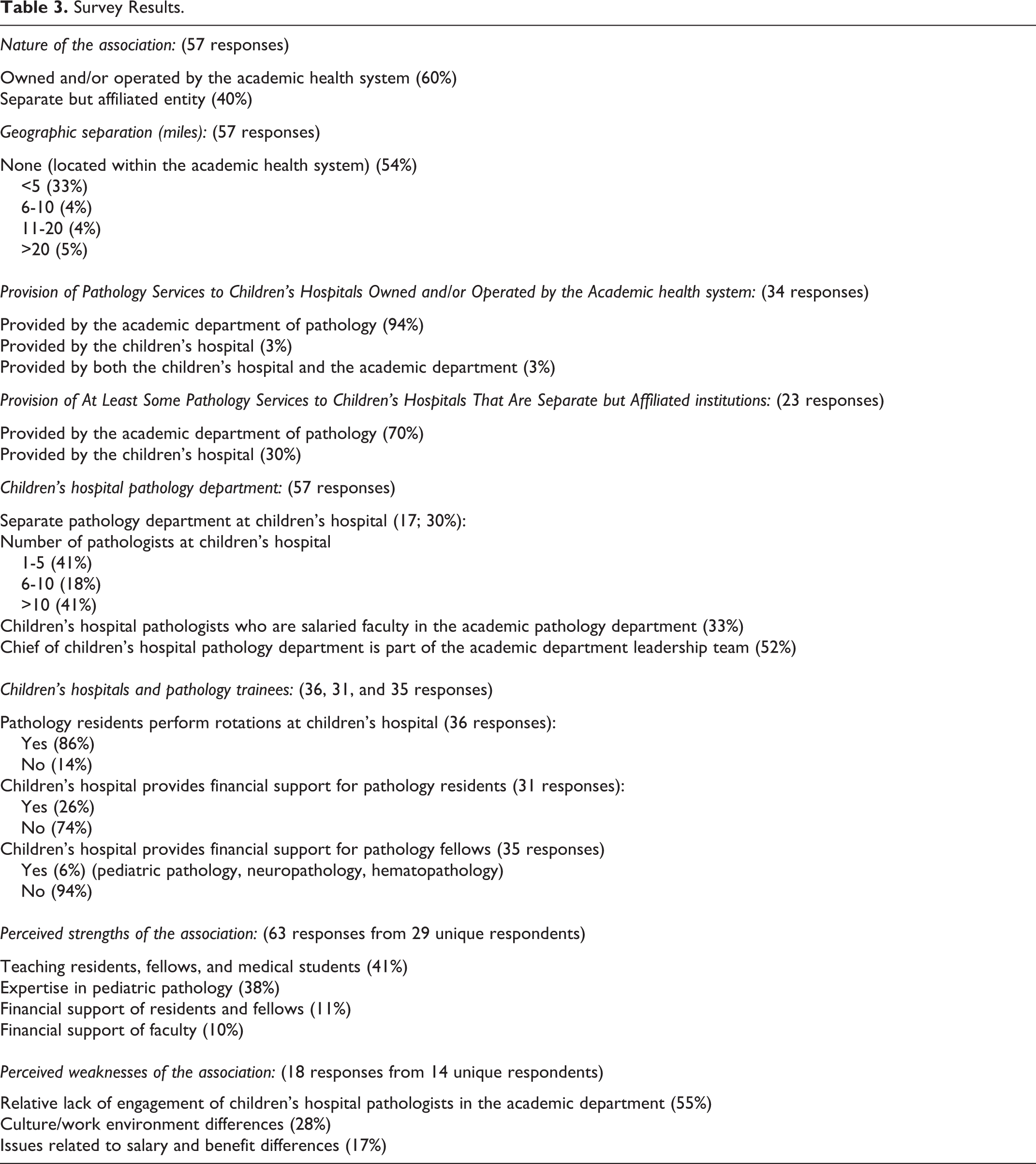 The finding that 94% of the 34 academic pathology departments whose associated children’s hospitals are a part of (ie, owned and operated by) the academic health system and provide the clinical services for that hospital indeed emphasizes the importance of this association to the core missions of the department. Even for the remaining 23 respondents with children’s hospitals that are not part of the academic health system, 70% of academic pathology departments reported that they provide at least some clinical services for the children’s hospital.