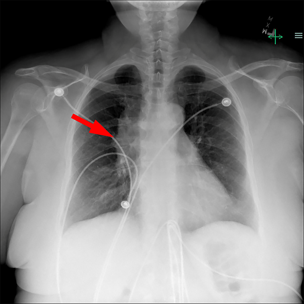 Chest radiography shows an enlarged mediastinal shadow on the right (arrow), suggesting a mediastinal mass.