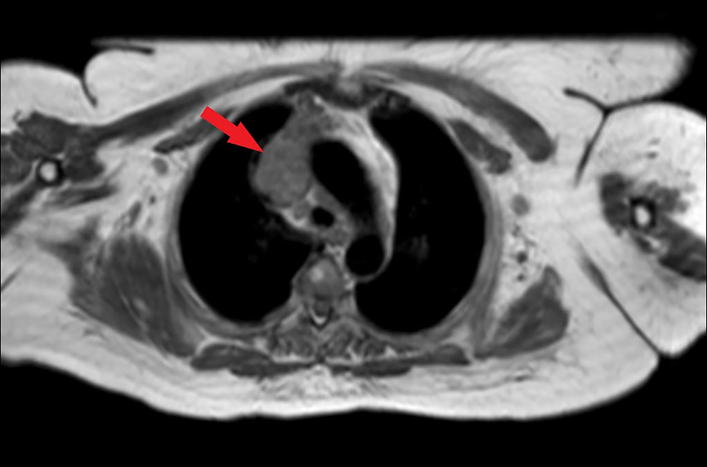 A chest radiograph is performed and shows an enlarged mediastinum suggestive of a mediastinal mass (Figure 1). Based on these findings, a magnetic resonance imaging scan of the chest is performed, which confirms an anterior mediastinal mass (Figure 2). The mass is well-defined without invasion of surrounding structures and does not show areas of hemorrhage, necrosis, calcification, or cystic change.