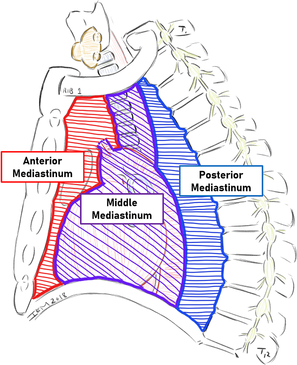 The mediastinum is divided into 3 anatomic compartments, designated anterior, middle, and posterior.