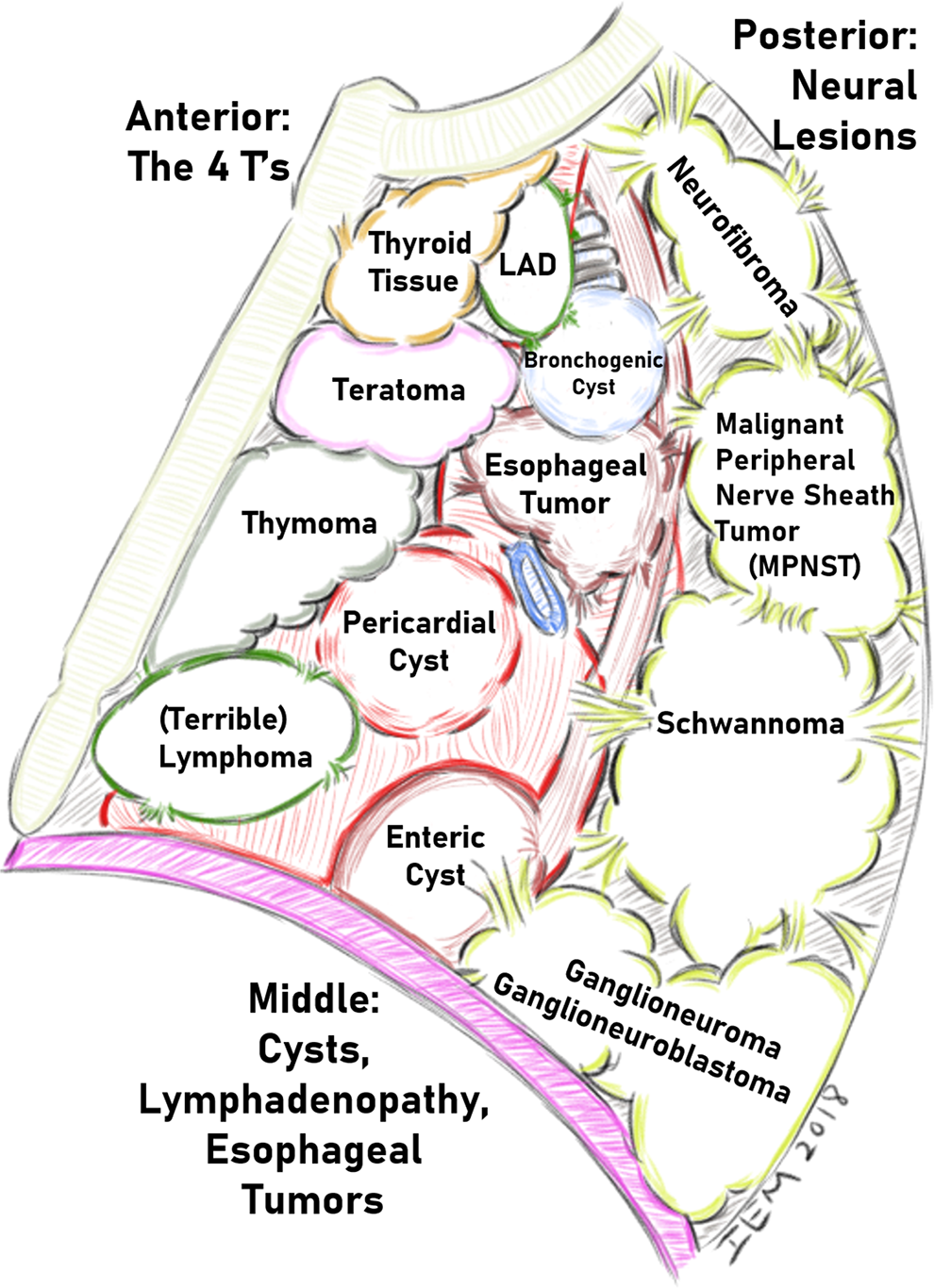Different lesions typically arise in each of the 3 compartments of the mediastinum, and this allows one to use the location of a lesion to shape the differential diagnosis of a mediastinal mass (Figure 4). The popular memory tool for recalling lesions of the anterior mediastinum is the 4 T’s. This includes