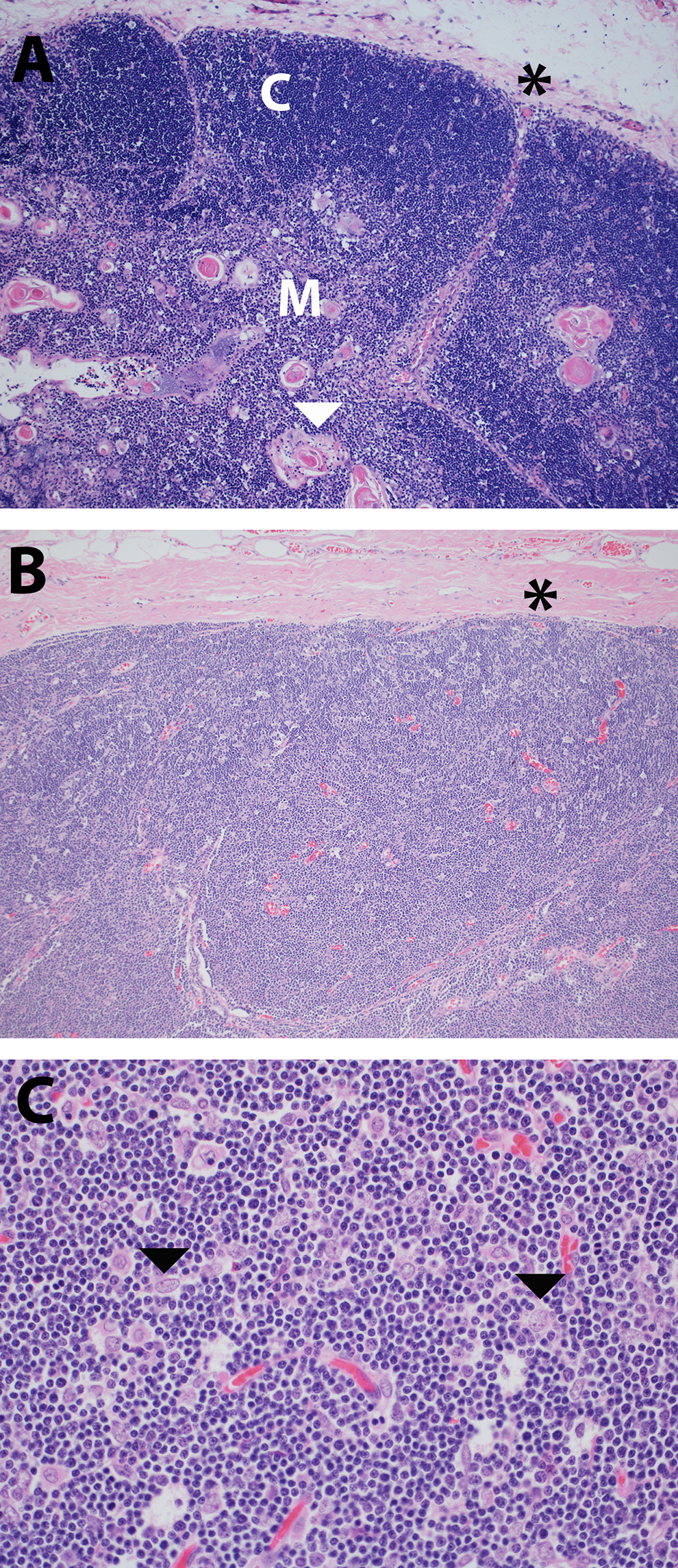 A, A normal pediatric thymus contains a well-demarcated cortex (C) under the capsule (asterisk) that appears darker. The medulla (M) appears lighter and contains Hassall corpuscles (arrowhead). Fatty replacement occurs with age, such that adipose tissue is the main component of the adult thymus (hematoxylin and eosin, original magnification ×100). B, The patient’s thymus is cellular (not predominantly composed of adipose tissue) and does not have a well-demarcated cortex and medulla. It appears as though the lesion is mostly composed of small cells. The capsule is indicated by an asterisk (hematoxylin and eosin, original magnification ×100). C, Higher power reveals numerous small lymphoid cells with intermixed larger, polygonal epithelial cells (arrowheads) (hematoxylin and eosin, original magnification ×400).