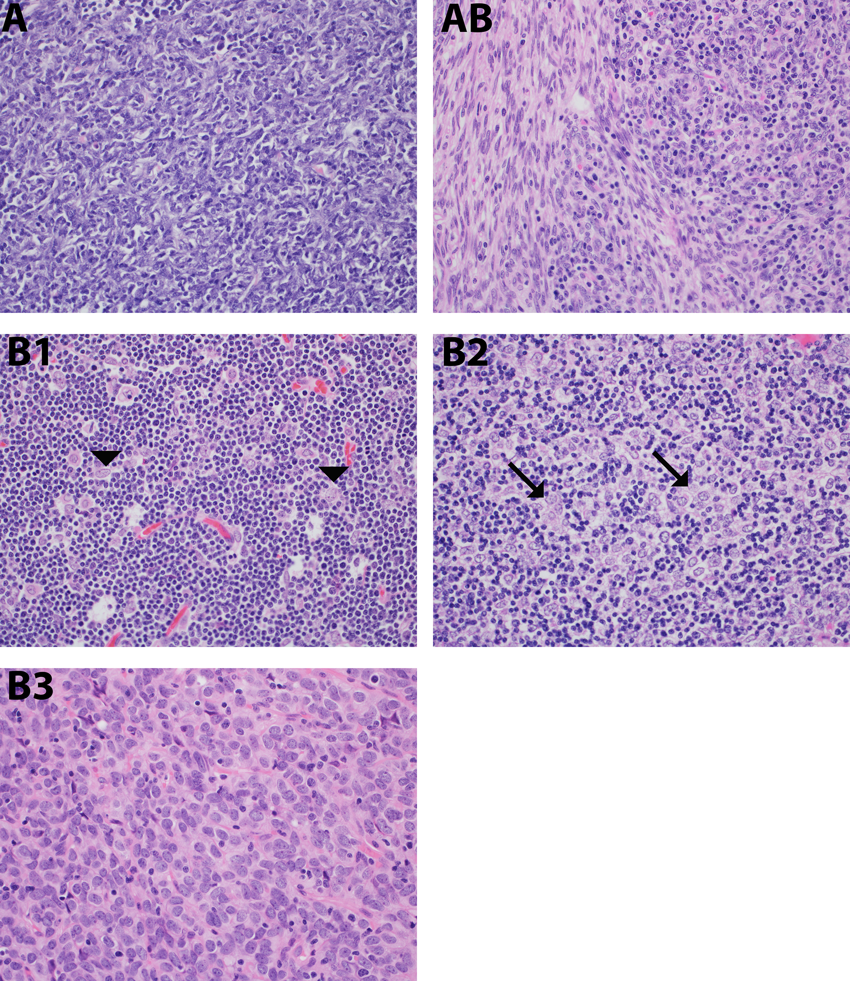 Type A thymomas are composed of spindled epithelial cells with rare lymphocytes. Type AB thymomas also contain spindle-shaped epithelial cells but with the addition of many thymocytes as seen on the right side of the image. Type B1 and B2 thymomas contain polygonal epithelial cells and many thymocytes, with the epithelial cells showing clustering in type B2 (arrows) but not B1 (arrowheads). In type B3 thymomas, thymocytes are again sparse to absent, with sheets of somewhat atypical epithelial cells. (All images are hematoxylin and eosin, original magnification ×400).
