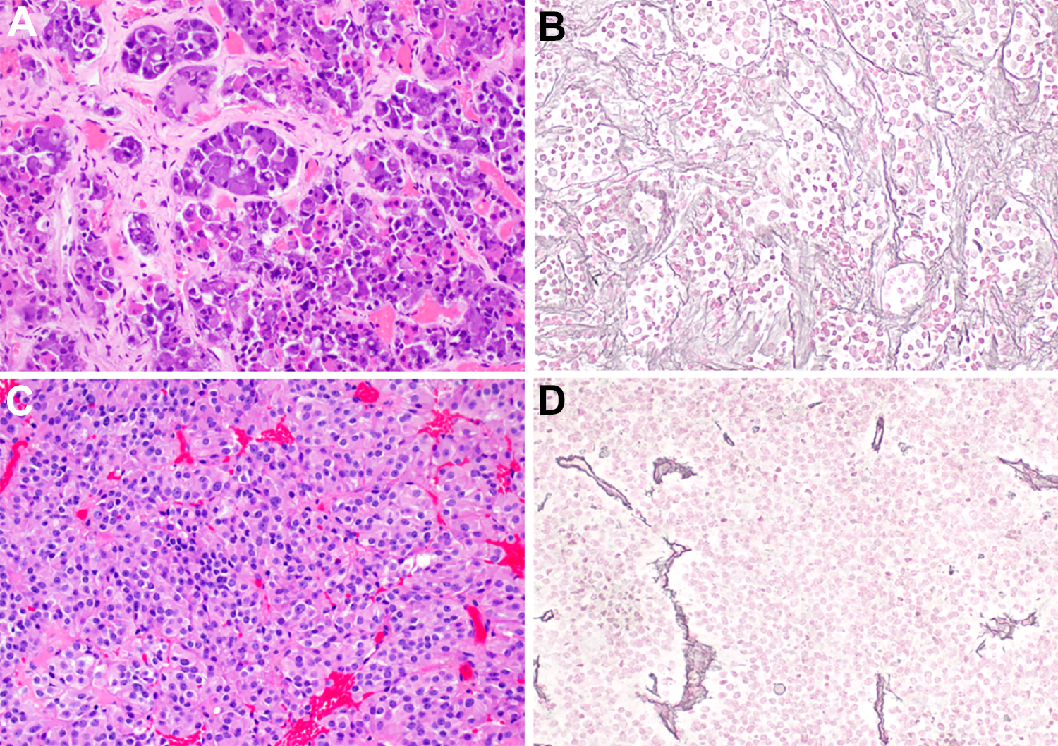 Histologic features of normal adenohypophysis and a pituitary adenoma. (A) A hematoxylin and eosin–stained section of normal anterior pituitary shows nests with acidophils, basophils, and chromophobes. (B) A reticulin special stain highlights the abundant connective tissue that surrounds the nests of endocrine cells. (C) A representative hematoxylin and eosin–stained section shows a neoplasm arranged in variably sized sheets and nests of mildly pleomorphic cells with amphophilic cytoplasm, round to oval nuclei, and stippled chromatin. (D) The reticulin connective tissue network is nearly absent in the pituitary adenoma. Magnifications, ×200.