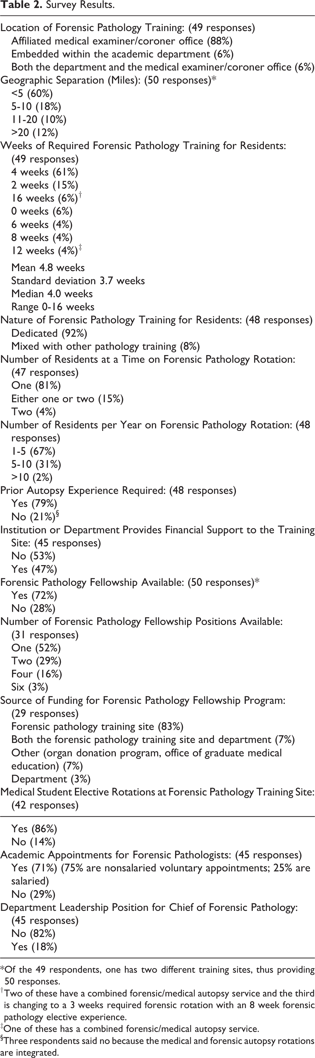 † Two of these have a combined forensic/medical autopsy service and the third is changing to a 3 weeks required forensic rotation with an 8 week forensic pathology elective experience.