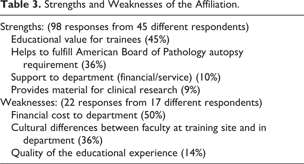 Of the weaknesses described in 22 responses from 17 different respondents (Table 3), half were related to the financial cost to the department, and about one-third (36%) were related to cultural differences between faculty based at the training site and those based in the department (36%). Only 14% indicated that the quality of the educational experience was of some concern.